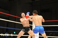 1R、上背で勝る玖村はサラビアの左ボディフックをもらうものの、左フックは見切り空を切らせていく。そして左右のミドル、跳びヒザ、ジャブと攻撃を散らす。サラビアは玖村のジャブに右スイングフックを強振してカウンターを狙う。玖村はミドルを入れ、ジャブで間合いを保ってサラビアのパンチをかわし、跳びヒザから攻めて出る。