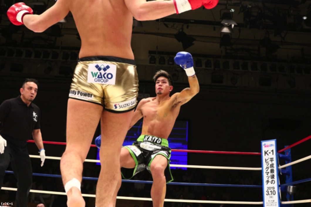 「(試合を振り返って?)自分のパンチがたまたま入って倒せたと思います。海斗選手はメチャクチャ強かったです。(対戦前と相手の印象に変化は?)変わらず強いってイメージです。どうやって倒すかが、自分の中でプレッシャーだったんで。勝っても海斗選手は凄く強いっていうイメージしかないので、これから自分もがんばっていきたいと思います。(今後の目標は?)K-1とKrushのチャンピオンを取ることです。あと、日本人トーナメントを8人で、-67.5kgでやったらおもしろいと思っていて。その一人に選んでもらえたら確実におもしろい展開になると思います」