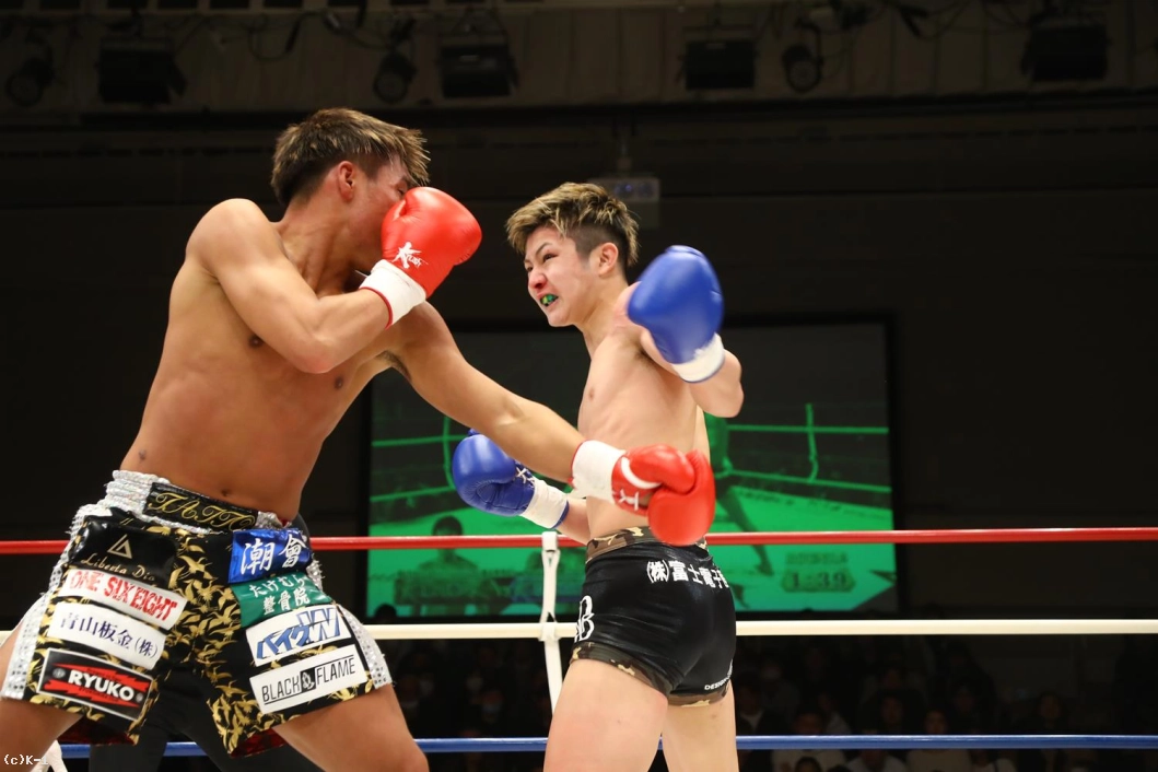 2R、ステップインしてパンチを振るう軍司だが、再び玖村にバッティングとなってしまう。やや時間をおいて試合再開。玖村はバッティングを気にしながらも左ボディフックを打ち込み、軍司のミドルもスウェーでかわす。ジャブ・左フックと先手で放つ軍司だが、玖村はカウンター、あるいは打ち返しで左フック・右ストレートでヒットを上げる。玖村は多発するバッティングにも熱くなることなく、歩を進めてブロックから打ち返しのパンチを当てていく。