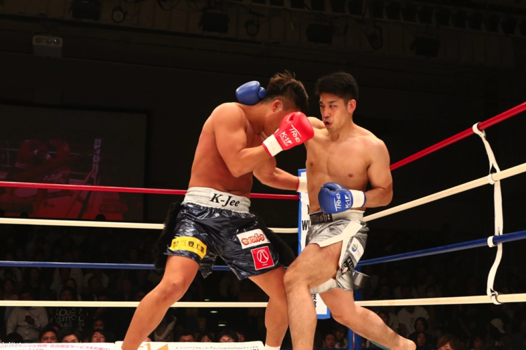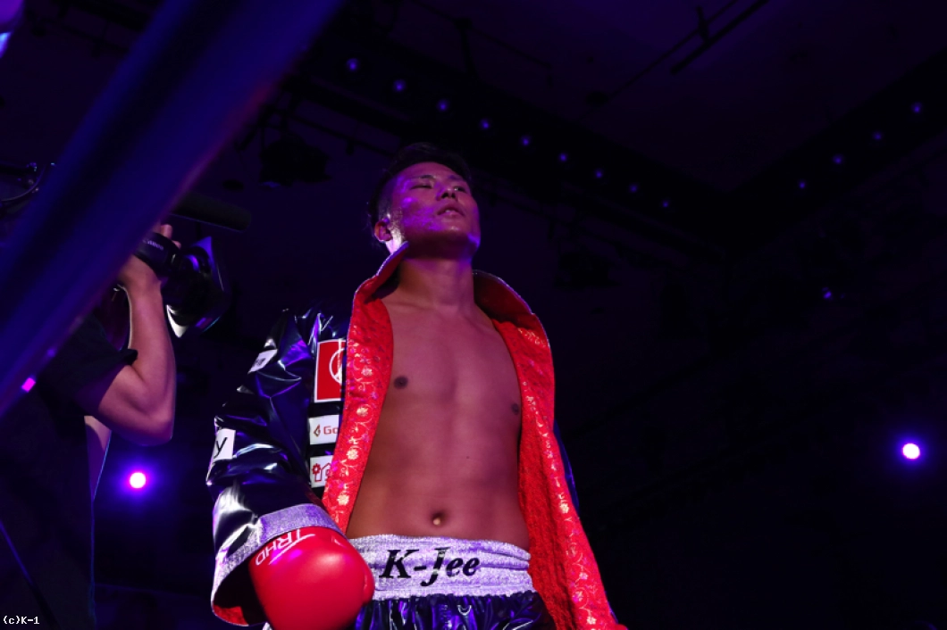2R、やはりこのラウンドも杉本はロープを背負う。カウンターのパンチを狙っているか。K-Jeeは圧力を掛け、杉本をロープ際から出させない。そして打ち合いを仕掛けると、杉本の右ストレートに合わせて右フック。これがズバリと決まって杉本は前のめりにダウンし、K-Jeeが決勝進出を決めた。試合後、決勝でクルーザー級王座を争うK-JeeとRUIがリングに上がって挨拶を行った。