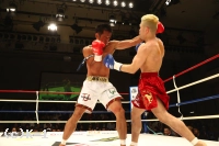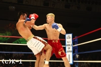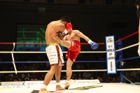 1R、サウスポーに構える友尊は足を大きく開いた構えから左ミドル・左ロー、左右のフックと力を込めた攻撃を振るう。しかし郷州はこれに気圧されることなくいつものように前へ出て距離を詰めていく。そして右のフェイントから左ストレートをヒット。グイグイ前に出て友尊の距離を潰していく。だが、そのリズムを見て取ったか、友尊はバックブローを放ち、これに郷州はヨロめく。友尊は左右フックを上下に放って猛ラッシュ。だが、郷州はこれをしのいで初回を終える。