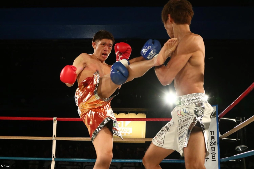 2R、勇治は右ミドル、右インローと放って入らんとするが、此尾が左ストレートからヒザ蹴りを繋いで圧力をかける。逆に勇治が出てくると、此尾は左ストレートでカウンター。勇治がパンチを振るって出ても、此尾はバックステップして対処し間合いを保つ。此尾はリーチを活かした攻めを展開し、ヒザ蹴り・ハイキックと飛ばす。ワンツーからミドルを繋ぐ勇治だが、ここは此尾に組みつかれて押さえられる。