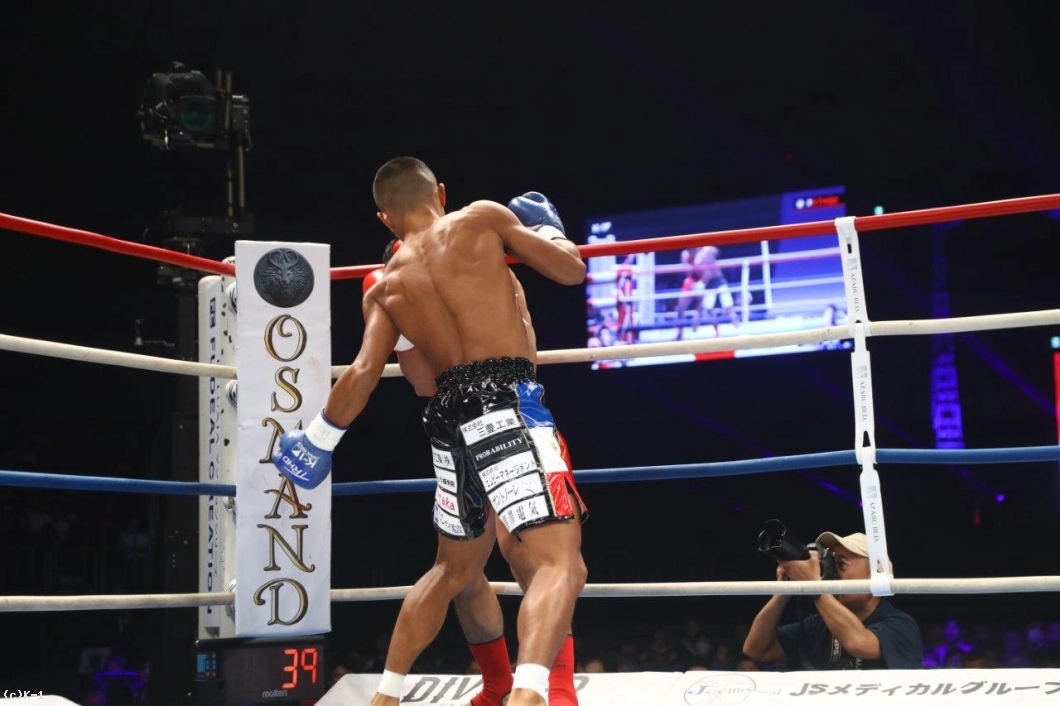 1R、江川は左インロー、前蹴りと前に出ていく。ジャオスアヤイは跳び顔面前蹴り。江川はしかしこれをブロックし、左右のボディフックで動きを止め、右ローから右フックにつなげるとジャオスアヤイは顔をしかめてダウン。立ち上がったジャオスアヤイだが、すでにダメージが深く、江川は右ローから右・左フック・左ボディフックと放ってジャオスアヤイを沈め、優勝を決めた。