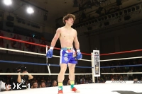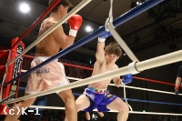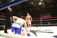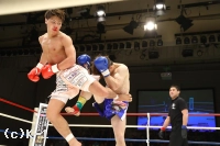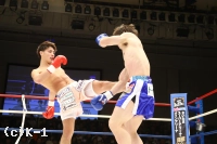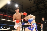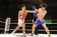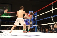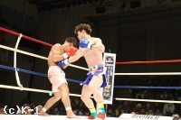 2R、ここも里見は跳びヒザを見せ、バックステップで距離を調整して金子の踏み込みにカウンターを狙う。里見の左ストレートが金子の側頭部をとらえる。金子はジャブの連打から左フックを振るうが、里見はこれを間一髪でかわす。金子のジャブを見切り、里見は踏み込んでの左ストレートをヒット。里見は前に出て来て、左ボディストレートから左ストレートと当て、金子は顔が紅潮してくる。里見は後ろ回し蹴りを見せ、金子はこれが効き体が折れるが、右フックを返してラウンドを終える。