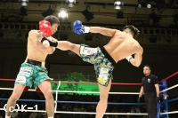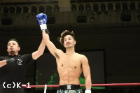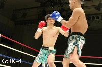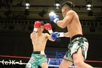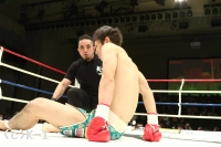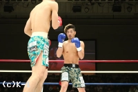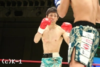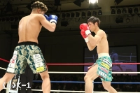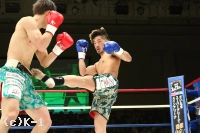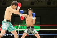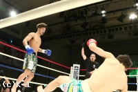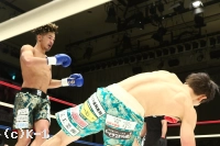 1R、オーソドックスの川﨑に対しサウスポーの東本。川﨑は右ミドル、右インローと放っていくが、東本は左ミドルを返す。蹴りでの探り合いから川﨑が右ストレートをヒット。東本が入ってきても川崎はスッとバックステップして間合いをあける。東本はミドルを放って、距離を掴まんとする。右ストレートを当てた川﨑だが、前に出たところに東本がカウンターのバックブローを当ててダウンを奪う。立ち上がる川﨑だが、レフェリーはダメージの様子を見て試合を止めた。