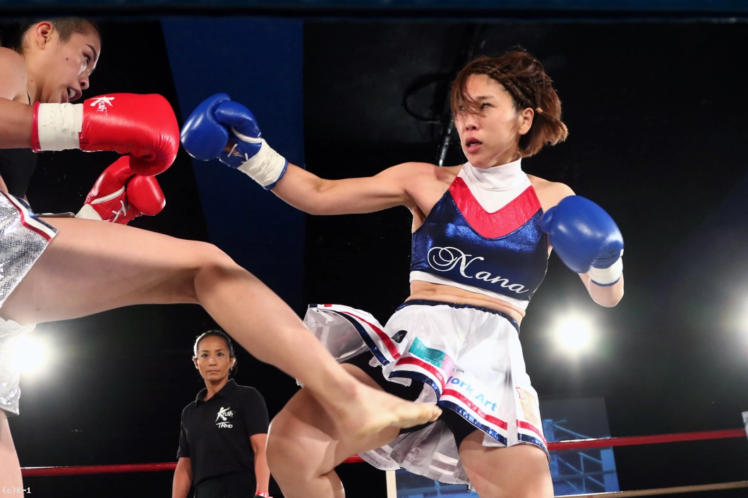 2R、NA☆NAは1Rより積極性を増して攻めるが、壽美が左ストレート、左ミドルと圧力で上回り押していく。NA☆NAが打ち返してくると、壽美はサイドに小さくかわして反撃の圧力を受けない。右ジャブと前蹴りも巧みに使い、壽美はNA☆NAを懐に入らせない。