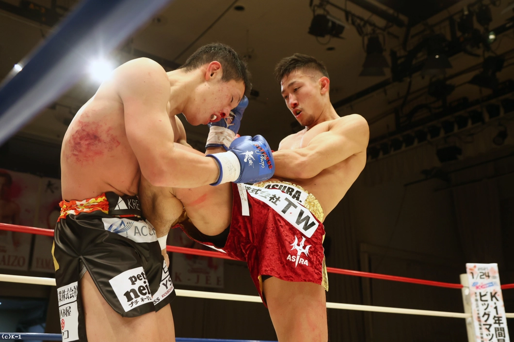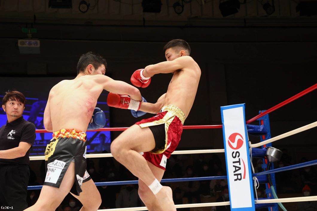 延長R、三輪は距離を詰めて左フックをボディ・顔面と打ちつける。伊藤も左右ストレート&ヒザでこれに対抗。三輪はガードを上げてプッシュして伊藤を下がらせ、ローを蹴り込む。伊藤も押し返してヒザを突き上げる。三輪は終盤押して出て、左右スイングフック。これでヒットを上げ終える。判定はジャッジが伊藤、三輪と割れた後で最後の1人は三輪。接戦を制した。