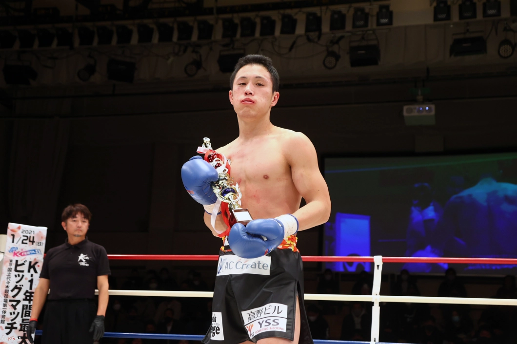 「伊藤選手は思ったより左ミドルが強くて、対策を立てていたのに思うようにハマらなうて。1Rは少し効かされたけど、3Rにダウンを取れてよかったです。(今後の目標は?)一戦一戦必ず勝てば次が見えてくるので、先というより次も勝ちます」