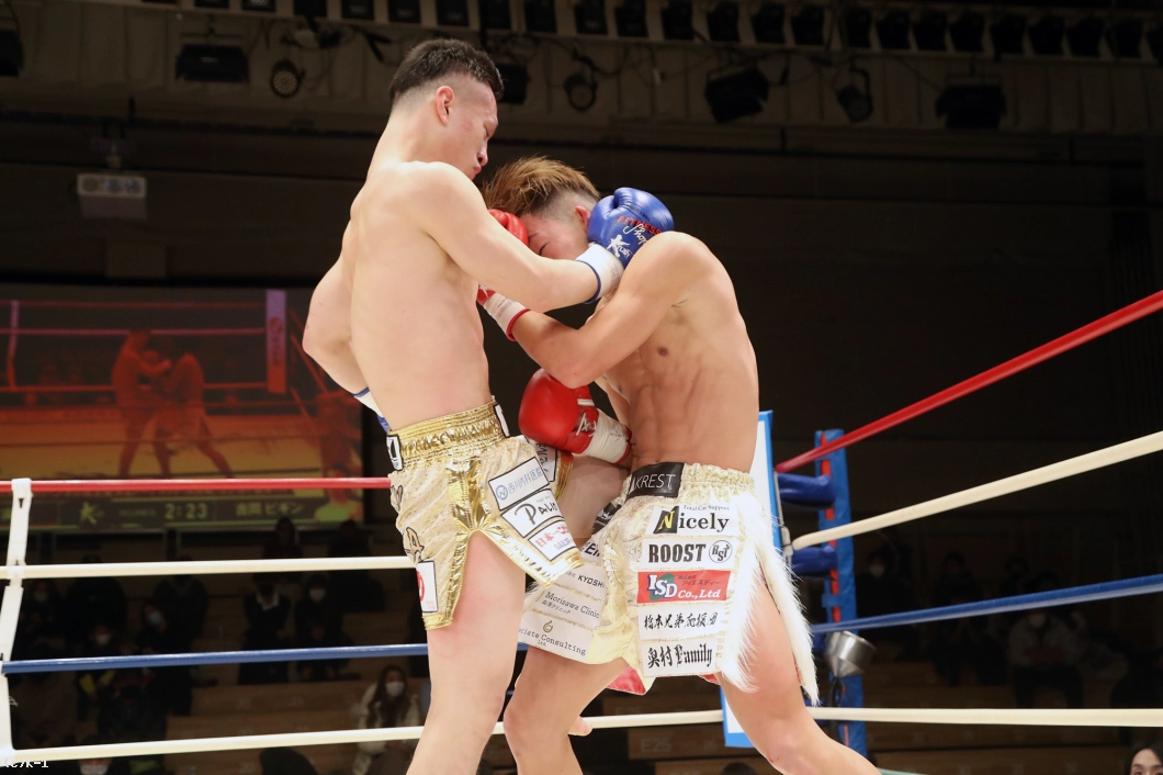 2Rも両者はガードを高く固くして接近する。パンチから組んでのヒザを放ってしまった吉岡に注意が与えられる。吉岡はしかし大振りせずガードからのジャブを当てる。対して橋本はパンチに力を込めるがとらえられず空を切る。橋本はパンチからミドルを繋ぐが、やはりパンチのクリーンヒットは得られない。