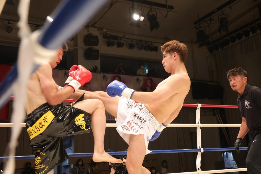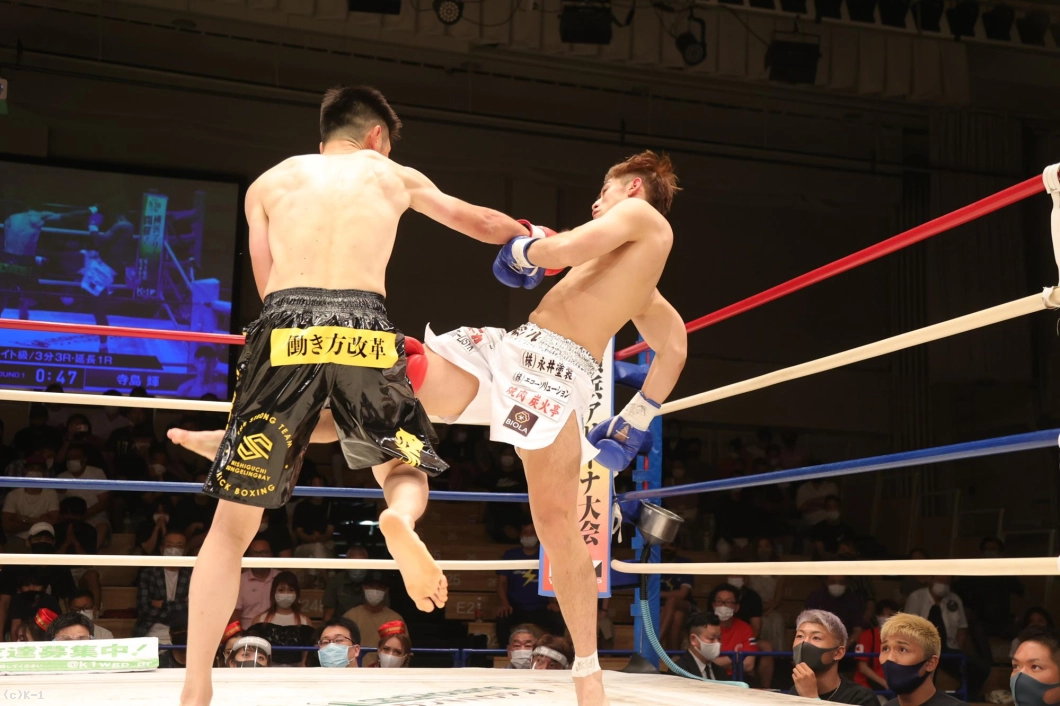 2Rも松本はガードを上げて前に出るが、寺島はカーフキックを効かせ、フックでも松本をとらえる。寺島は松本の前進を押しのけ右カーフキックを打ち込みダウンを奪取。立ち上がった松本は再び前に出る。そこに寺島は左フックと右ストレートでラッシュ。再びのカーフに松本は足を引きずりながらも倒れない。