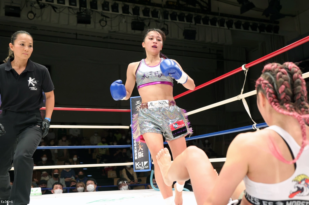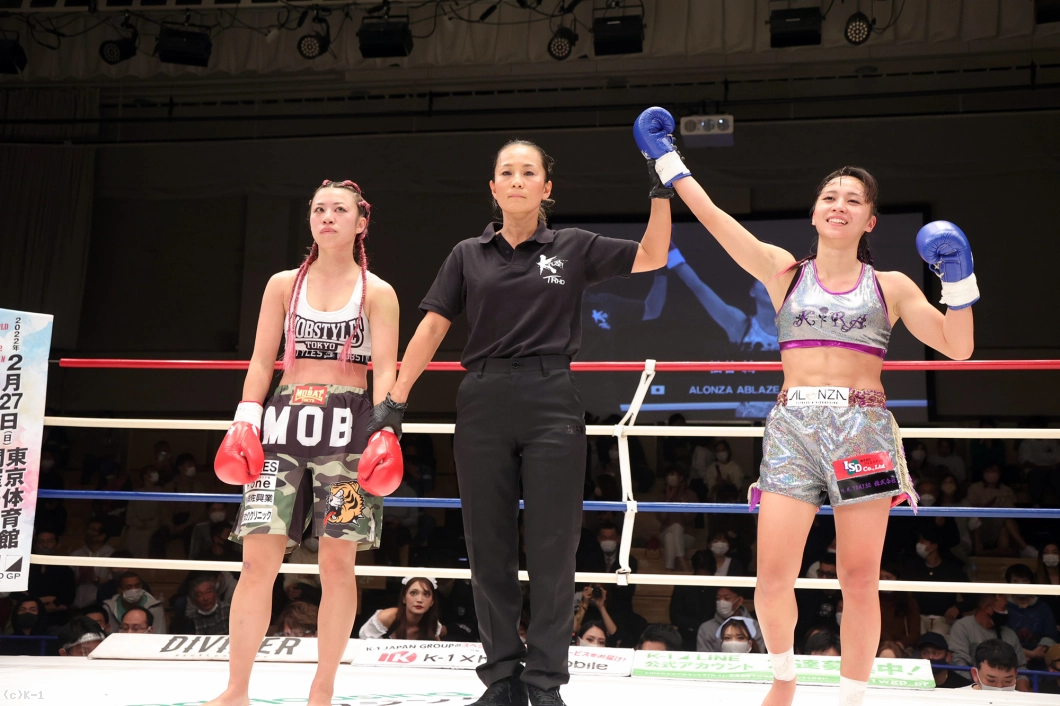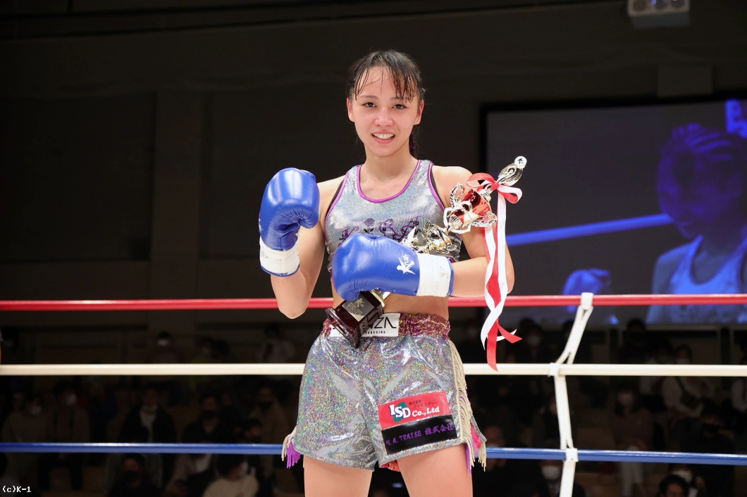 「1年ぶりの試合だったので、練習したことを出せるかなって不安だったんですけど、練習でやったことを出せたし、ダウンを取れて勝ったので今はホットしています。(作戦は?)私は蹴りが得意で、対戦相手は動画を見る限りどんどん攻めてくる感じだと思ったので、前蹴りやミドルで入らせないようにしてローを効かせられたらいいなと思っていました。私はパンチが苦手なんですけど、それで倒せたのもよかったです。(左右蹴っていたが?)両足使ってどんどん圧力をかけていきたいと思ったので、相手ではなくて自分がやりたいようにやりました。(初の公式戦で)8月のエキシの時も緊張感はあって、初めての公式戦で緊張したんですけど、「思う通りの動きが出来てうれしいです。(今後の目標は?)上しか見ていないので、菅原美優選手やMIO選手みたいにどんどんキャリアを積んで倒せる選手になってベルトを獲りたいです。(ファンのみなさんへのメッセージ)今日は応援ありがとうございました。もっともっと強くなって倒しきれる選手になります。またすぐ試合をして、上を目指して頑張りますので応援よろしくお願いします」