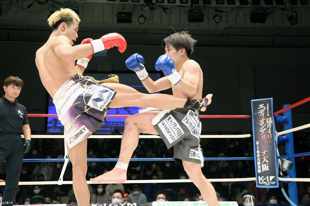 2R、池田の強い右ミドルに合わせ藤田がワンツーで応戦。カウンターの右オーバーハンドフックで池田にプレッシャーを与える。距離を詰め左ボディ・左アッパーとパンチを上下に散らす藤田へ、池田は飛びヒザ蹴り。冷静にガードを固める藤田はコーナーを背負う池田に右フックから左ボディとコンビネーションをヒット。頭を振りながらフル左フックを浴び、池田が小さくぐらつく。池田は左右ストレートで突き放し、飛びヒザ蹴りを突き上げ藤田のアゴを跳ね上げる。