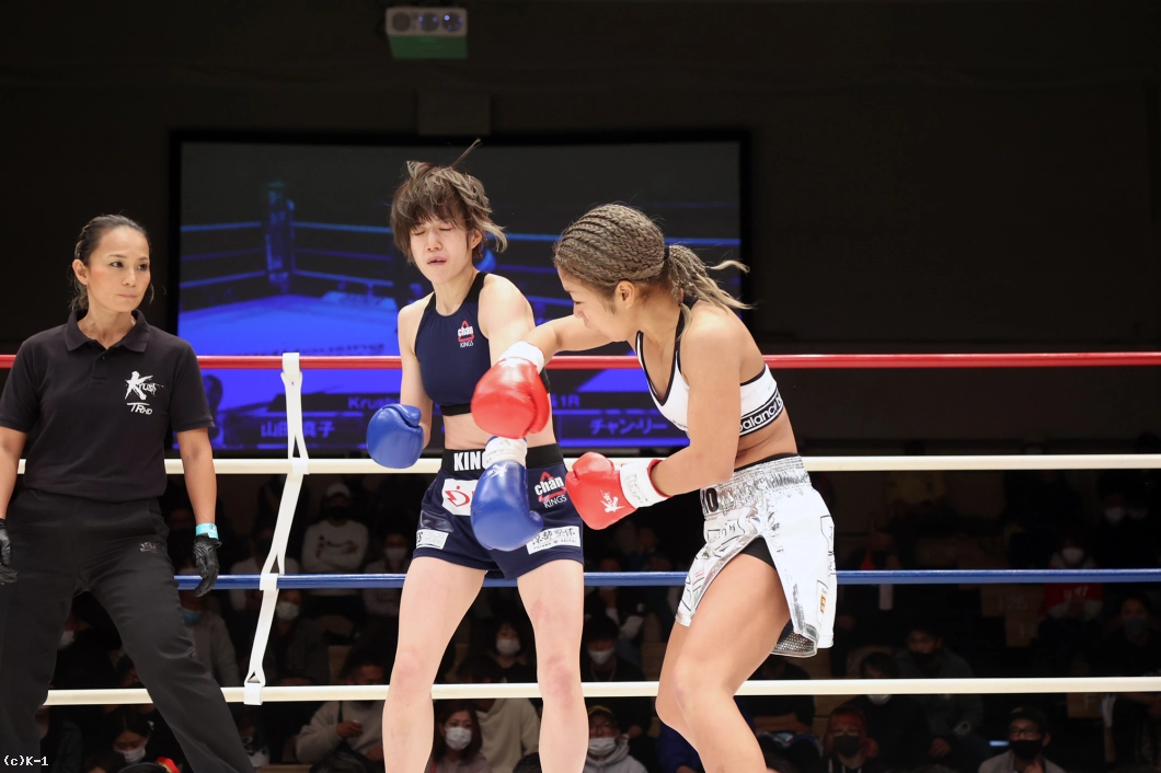 3R、チャン・リーの右ミドルの打ち終わりに飛び込んで左フックを見せる山田。チャン・リーの前手を左ジャブで触り右ロー。チャン・リーの右ミドルに合わせたフックを見せるが、蹴り足を掴み注意を受ける。徐々に前手をかいくぐり左フック、左右ボディを浴びせる山田。山田の入り際にチャン・リーも右ミドル合わせる。突進する山田は強引に回転のいいフック。両者フックを打ち合う中試合終了のゴングが鳴った。判定は30-28、30-29、30-28で山田。勝利した山田だが、納得がいかないか笑顔を見せないままリングを降りた。