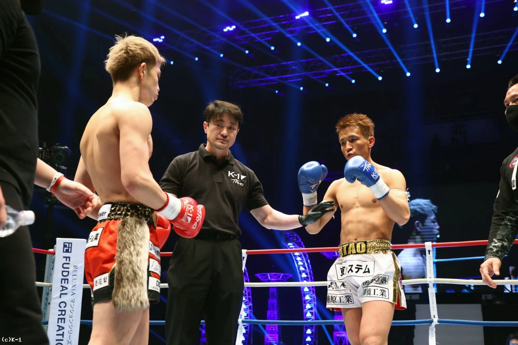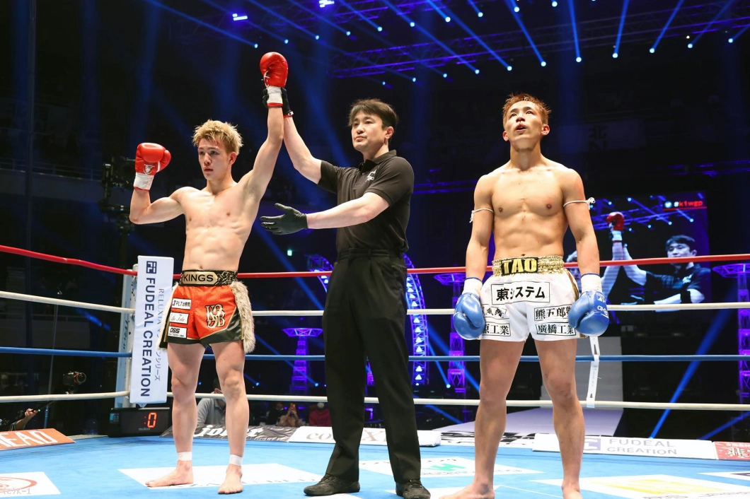 3R、両者足を止めてパンチの打ち合い。しかし玖村がカーフで鷹大の足を跳ね上げる。玖村はそこから飛びヒザを繋げる。玖村は右ストレートのフェイントを見せながら右カーフキック。しかし鷹大も左フックを好打して玖村の回転を止める。玖村は右ストレート、カーフ、ヒザと攻めて試合を終える。判定は30-28、30-28、30-28の3-0で玖村。荒々しさを見せ勝利した。