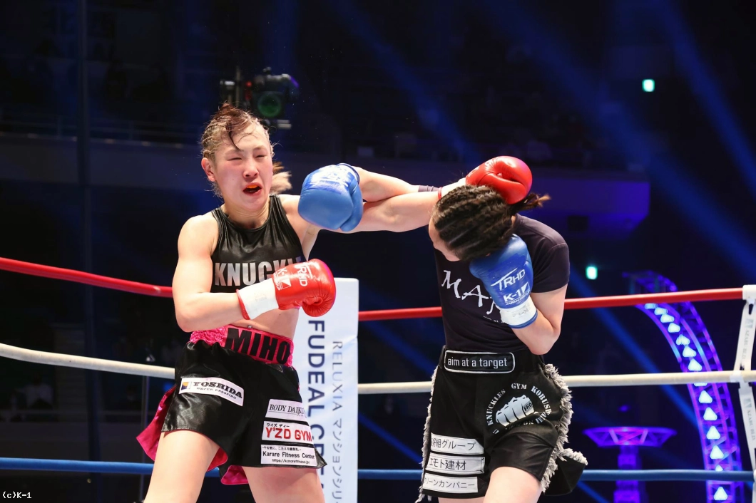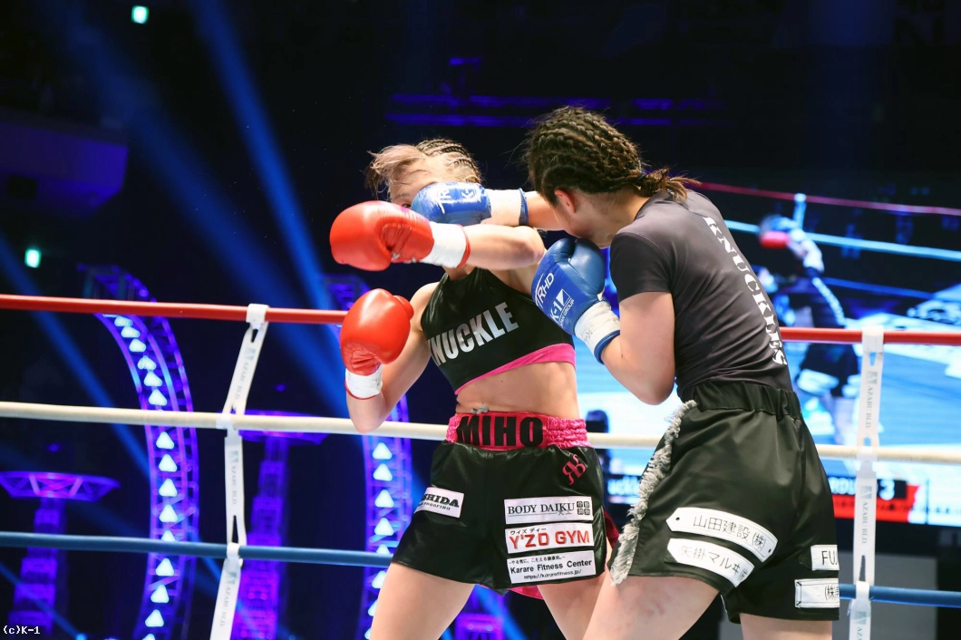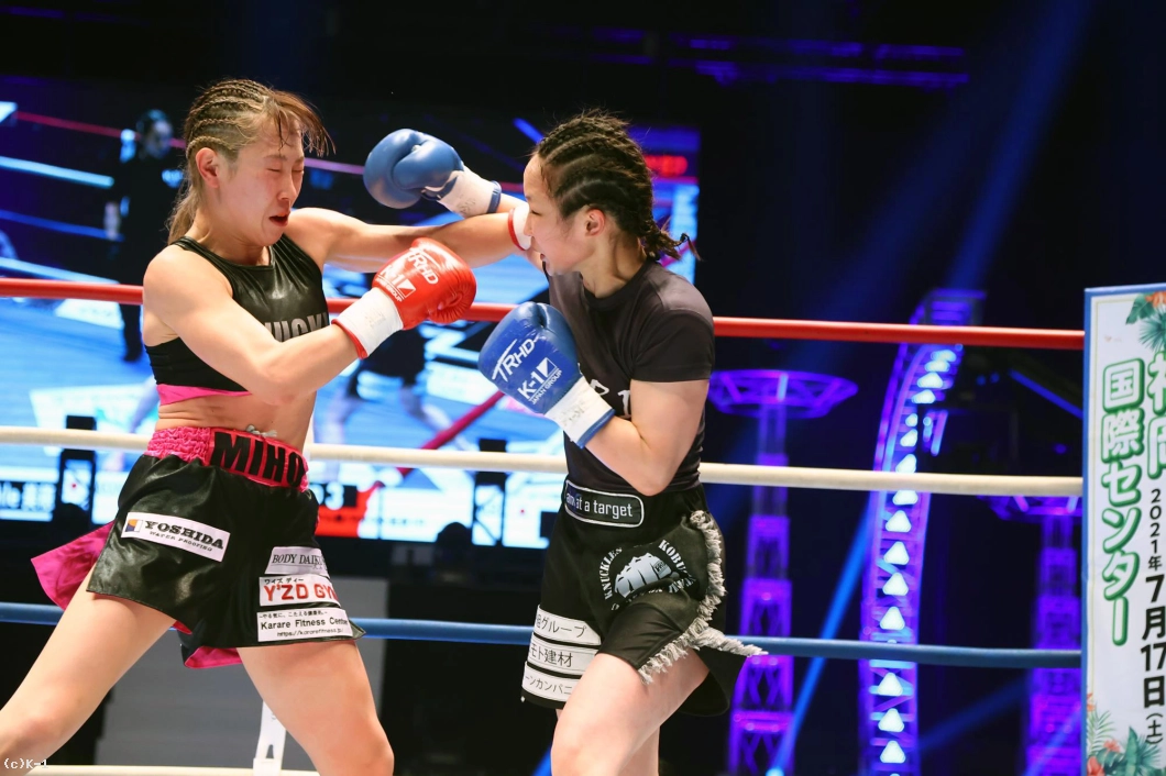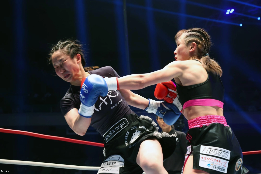 延長R、前に出る高梨にMARIはパンチの回転で応戦。その中で右ストレートで高梨をとらえる。高梨は左ボディフックを入れるが、MARIは右クロス、左ジャブ、バックブローとヒットを重ねる。高梨もミドルからワンツーを返すが、MARIはジャブ、右フックと当てる。MARIは右フック、右ストレート、左フックとパンチを回転させる。高梨も左右のストレートで応戦する。判定は高梨、MARIと割れた後で高梨。2-1で接戦を制した。