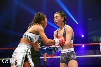 (地元での試合で心強かった?)すごく心強くて、リラックスして試合に臨めたんですけど、内容が、もうちょっと印象づけられるような、『K-1は女子の試合も面白いね』って思ってもらえるような試合にしたかったんですけど、そこが反省点ですね。(今後は?)リベンジしたいっていうのもあるし、ベルトができたら獲りたいっていうのもあるんですけど、今の自分はとりあえず決まった試合を1試合1試合勝って、結果を残していくことですかね。(ファンの方へメッセージを)たくさんの応援ありがとうございました。内容は反省する点がたくさんあるんですけど、自分にしかできない格闘家ストーリーじゃないけど、築き上げていけるようにこれからも頑張るので、応援よろしくお願いします」