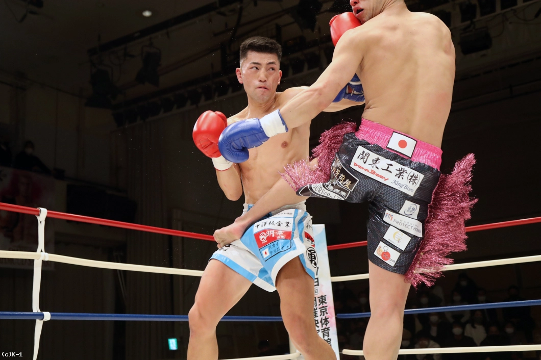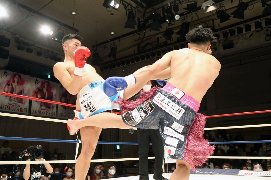 1R、サウスポーの横山がリング中央に立つ。横山、中島とローを入れるがどちらもまだ距離をあけて相手の出方を探っている。中島はしかしそこから踏み込んでのローを当て、変則的な高い蹴りでも横山を脅かす。