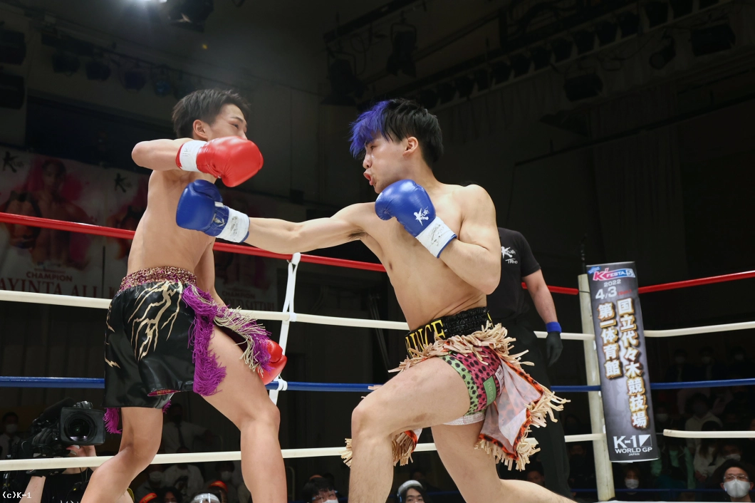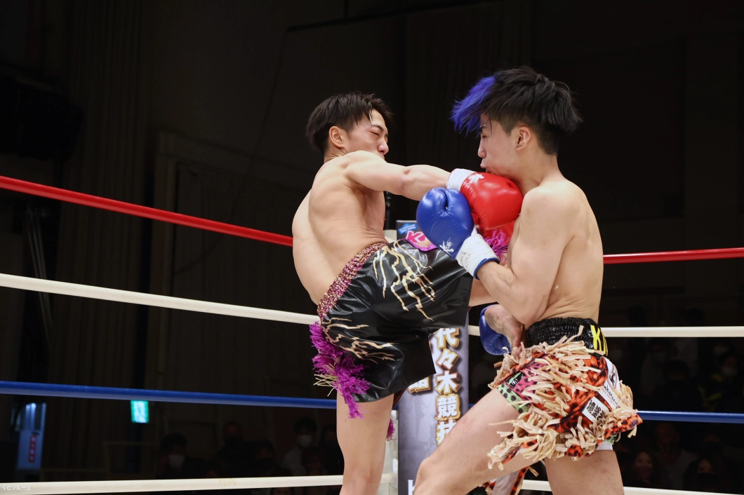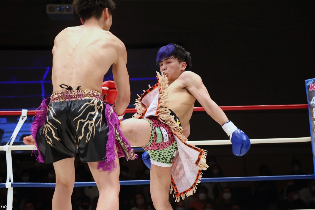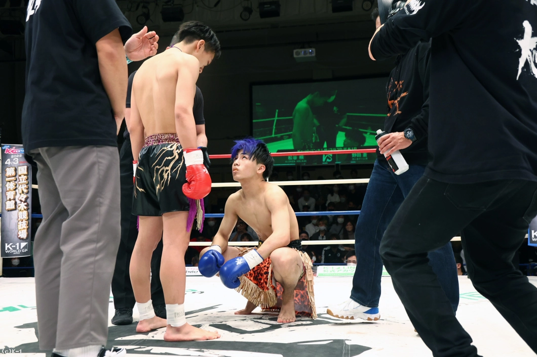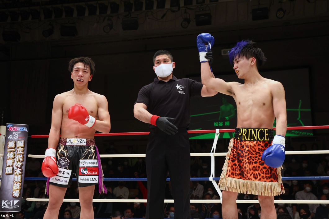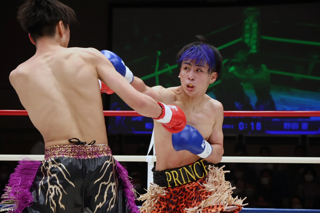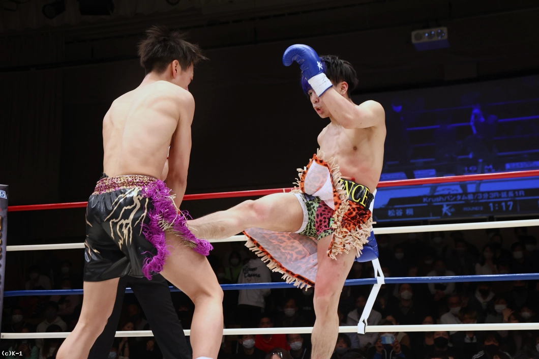 1R、松谷がサウスポーから左ミドル、野田がオーソドックスから右ミドルと互いに強い蹴りを当て合う。松谷は圧力を掛けコーナーに追い込むが、野田はそこからグッと前に出出て右ストレートを当て、松谷のアゴを跳ね上げる。右ボディフックも打ち込んだ野田は、左アッパーから右ストレートにつなげてダウンを奪う。立ち上がる松谷だが焦りが見え、野田はすかさず右ストレートを打ち込み2度目のダウンを奪う。