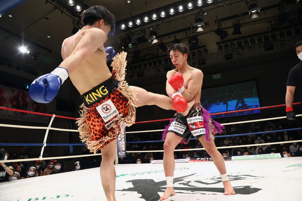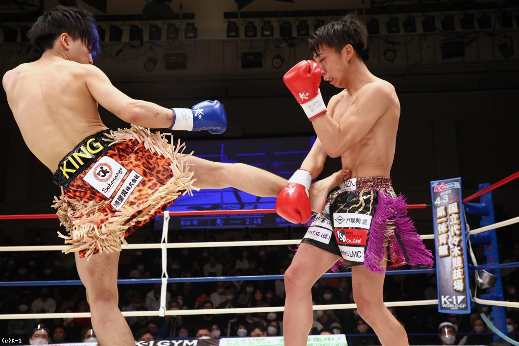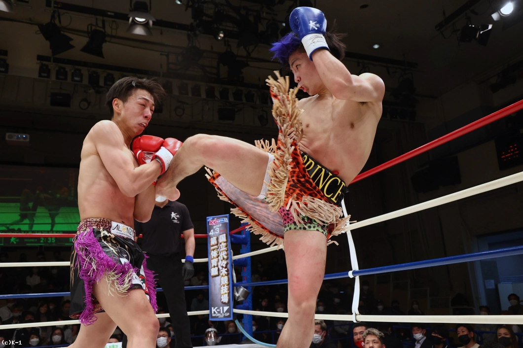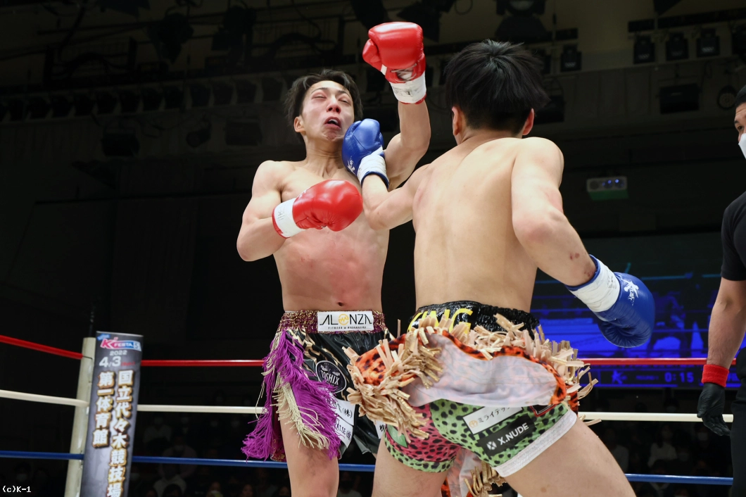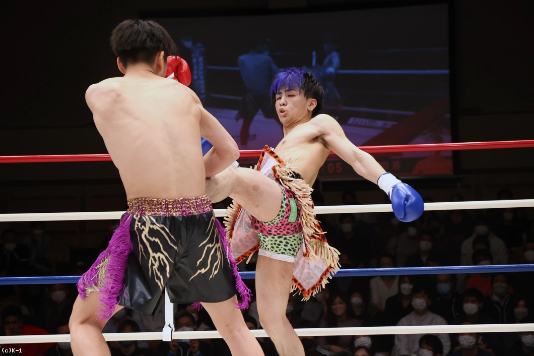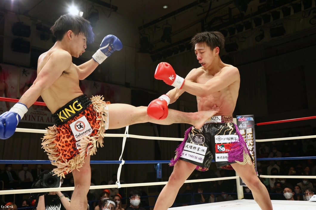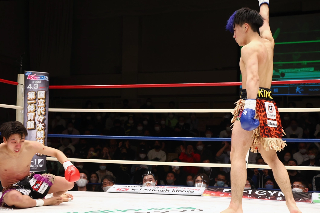 1R、松谷がサウスポーから左ミドル、野田がオーソドックスから右ミドルと互いに強い蹴りを当て合う。松谷は圧力を掛けコーナーに追い込むが、野田はそこからグッと前に出出て右ストレートを当て、松谷のアゴを跳ね上げる。右ボディフックも打ち込んだ野田は、左アッパーから右ストレートにつなげてダウンを奪う。立ち上がる松谷だが焦りが見え、野田はすかさず右ストレートを打ち込み2度目のダウンを奪う。