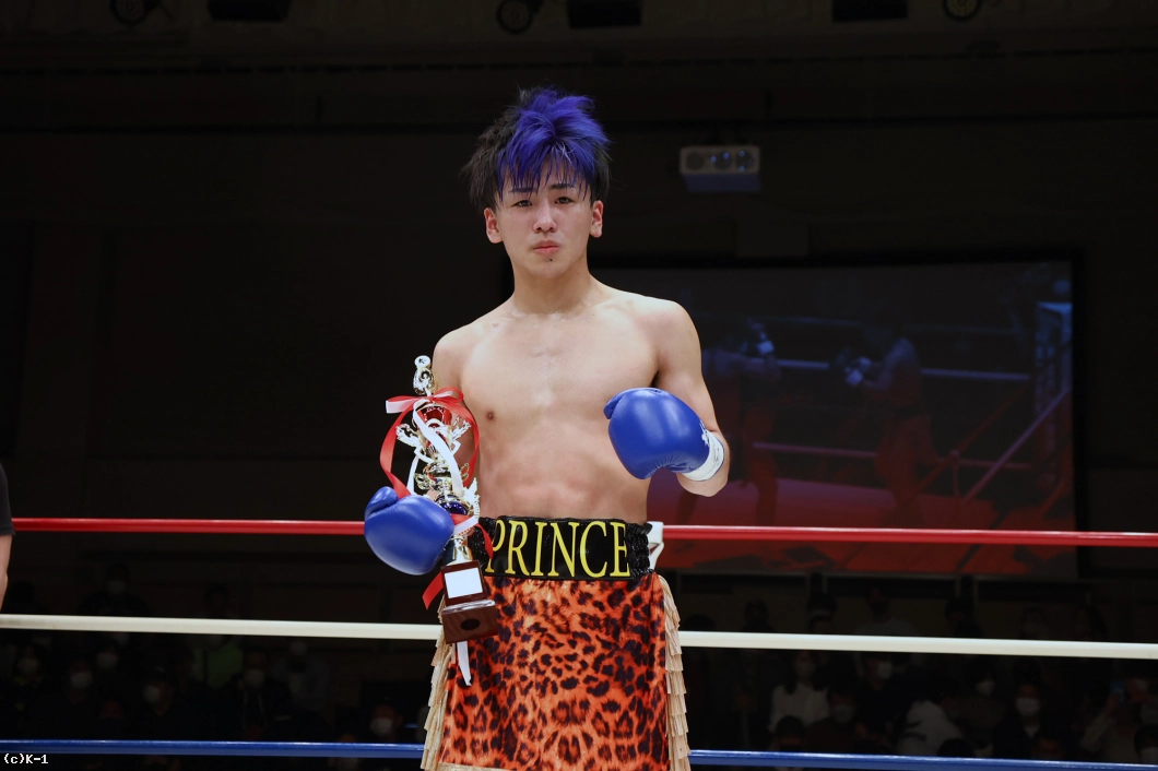 「倒すという部分ではちょっとは変わったところを見せられなかったと思います。すごく勝てて安心しています。(対戦相手の印象は?)1Rで倒せるつもりでやってたんですけど、パンチが当たらないというのが最初に思った感想で。蹴りも重くて途中で心が折れそうになったんですけど。支えてくれた人たちに勝って恩返ししたかったので、それが心にあって勝つことができました。(距離を取る作戦?)本当はプレスをkけるつもりやったんですけど、向かい合った時に松谷選手が予想以上に大きく見えて、プレッシャーのかけ方とか足の位置取りも嫌で。それで元の自分に戻ってしまっちゃいました。でも所々でではフェイントをかけて倒すというところは見せられたと思うので、進歩は見せられたかなと思います。(今後の目標は?)地味なチャンピオン僕が倒して、僕がチャンピオンになろうと思うので。すぐタイトルマッチお願いします」