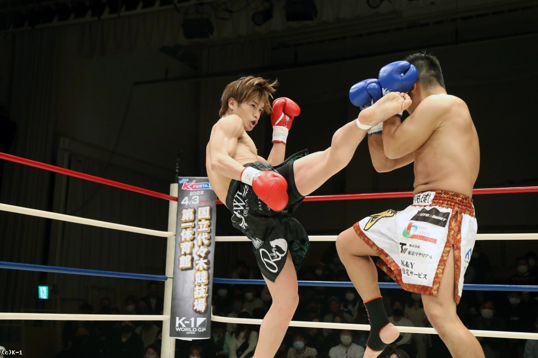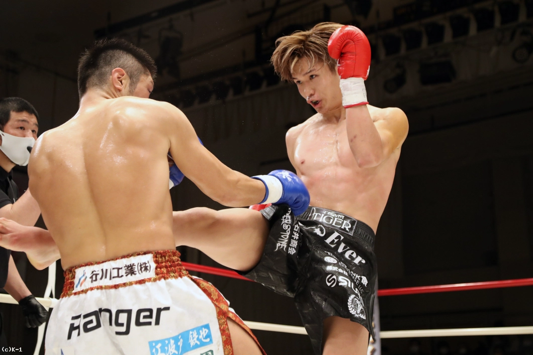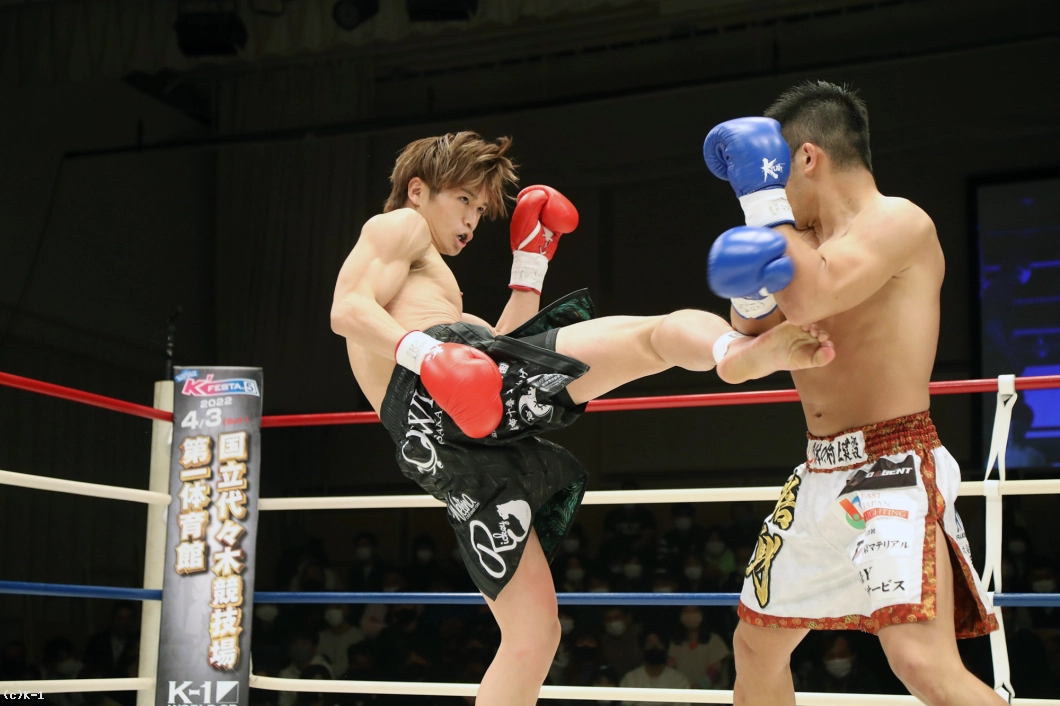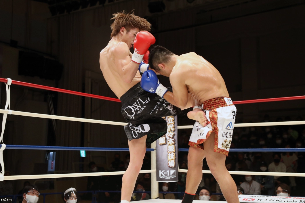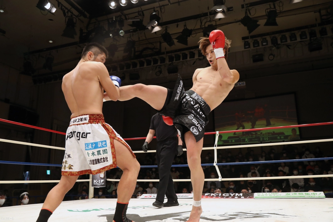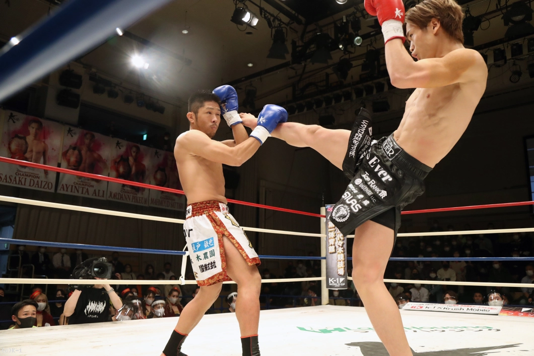2Rも立基は間合いを保ち、変わらず右ミドルと左カーフを当てていく。これに対し秀樹は右フックと左ストレートを振るって迫るが、やはり立基に距離を取られる。そこから間合いを詰めるのに成功した秀樹だが、立基に偶発性ではあるもののバッティングを受けてしまう。