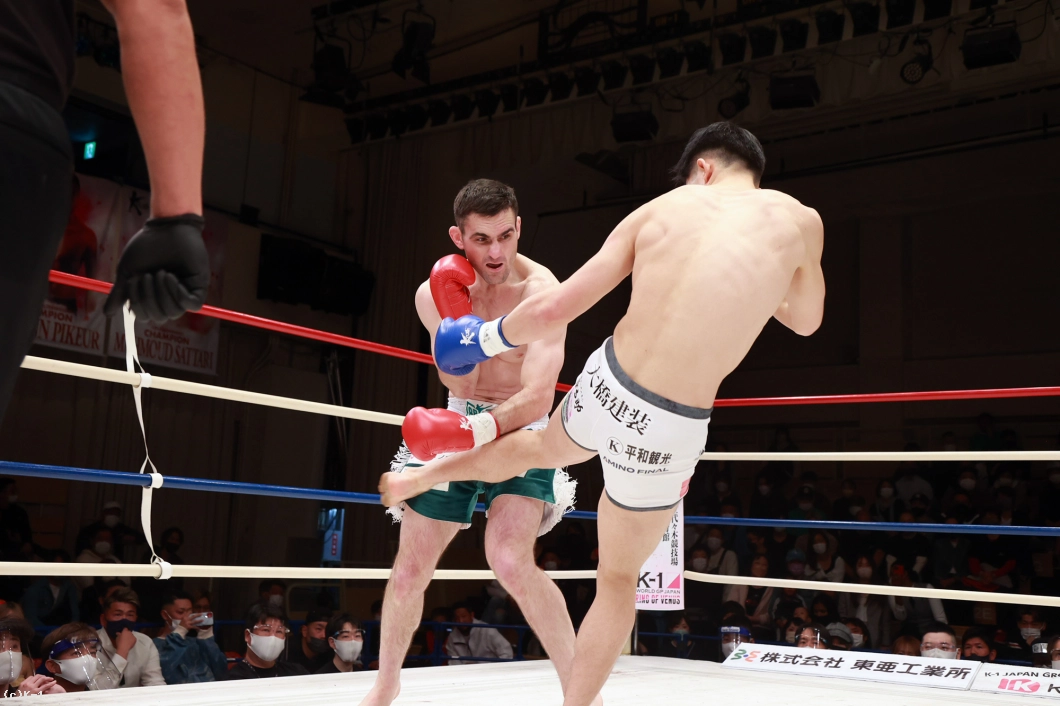 2R、稲垣はやはり懐を深く保って右ジャブ、右フック。さらに右ハイキックを当てる。トファネリは左眉からの出血が見られるが、稲垣に対し前に出て距離を詰めていく。しかし稲垣はこの圧力をかわして受けず、ボディアッパーを入れるなど削っていく。