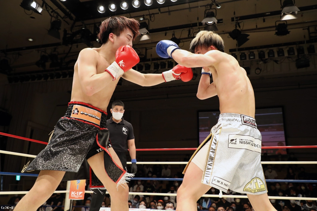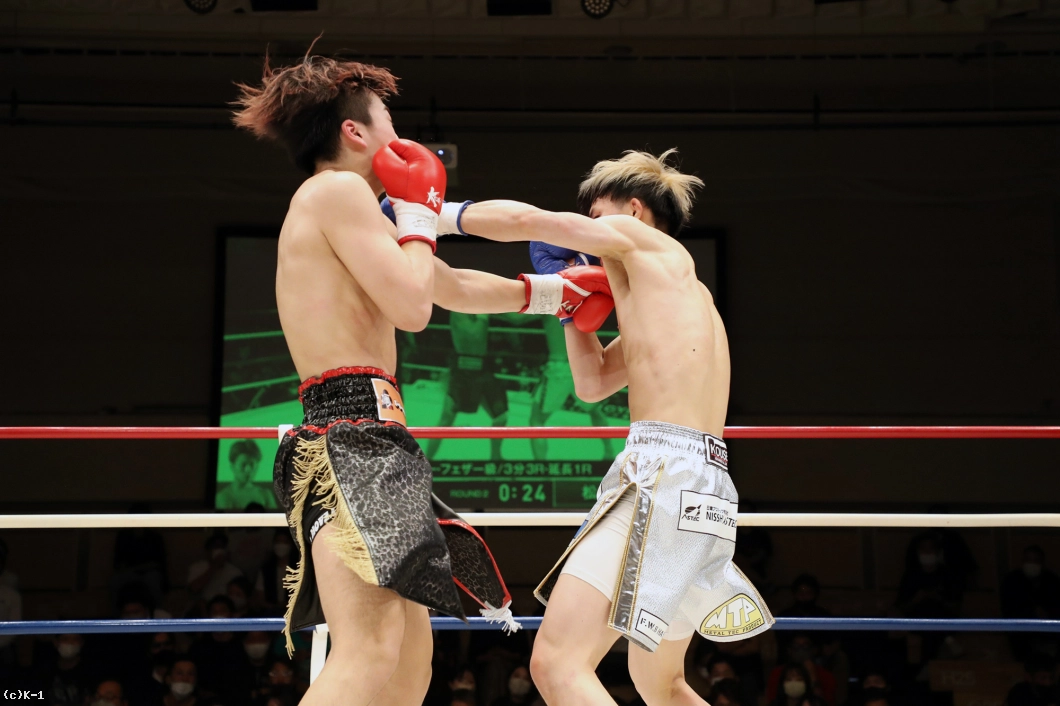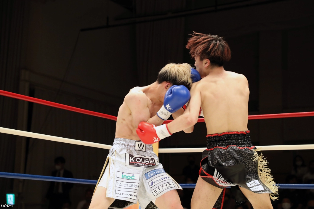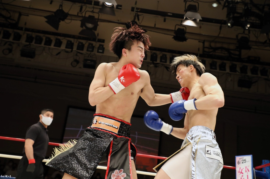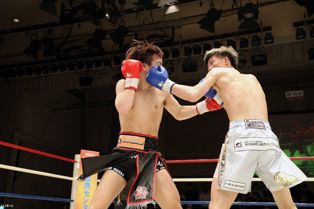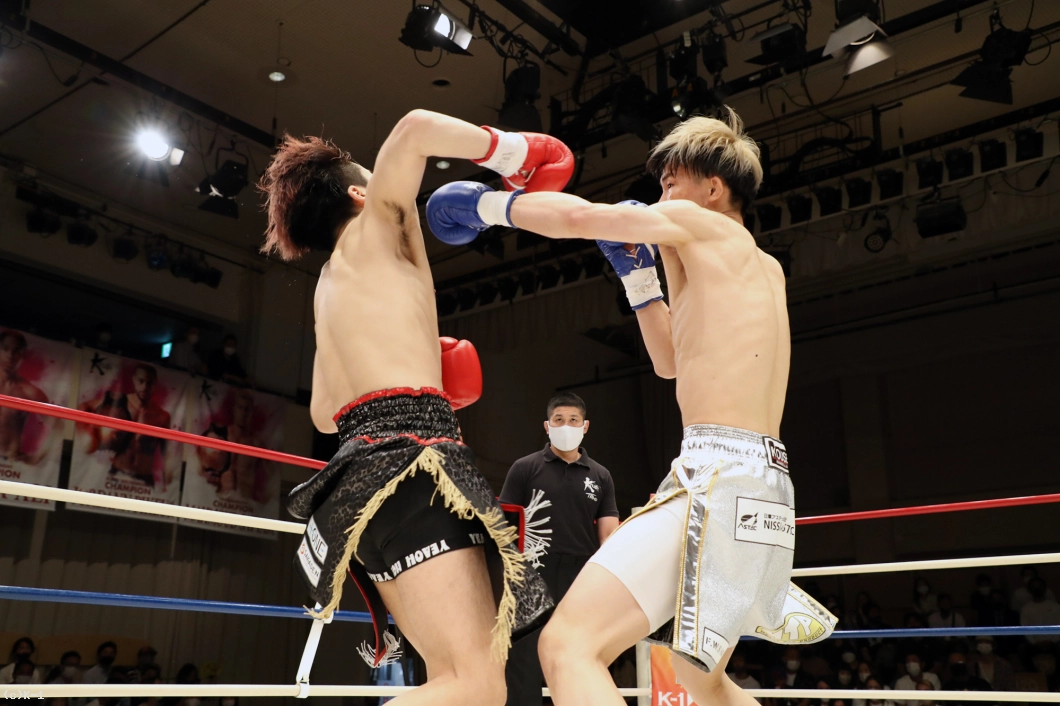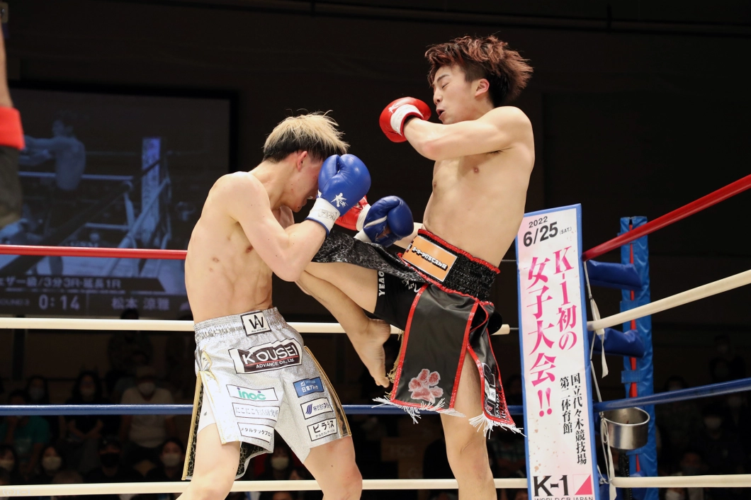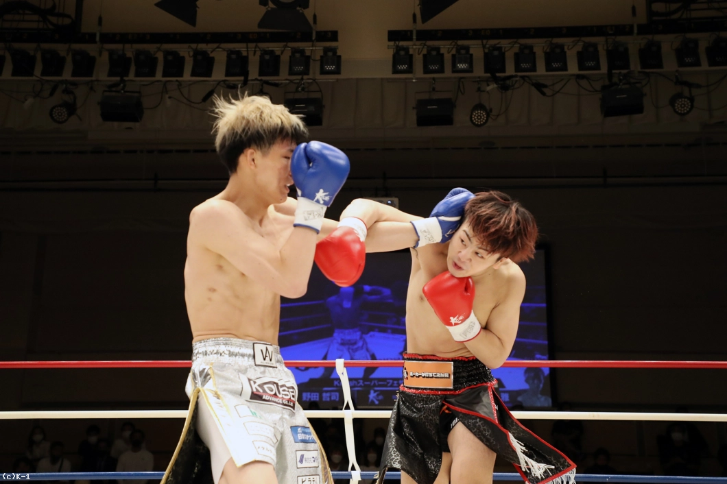 延長R、両者気持ちを出して打ち合いを展開。内側へ見舞う松本の足払いに野田が一瞬バランスを崩す。しかし野田は右ストレートをヒット。松本は距離を作って蹴りで反撃する。野田は左フックの上下打ちからハイキック、松本はヒザとパンチで両者印象を作りに行く。判定は10-9(松本)、10-9(野田)、10-9(野田)の2-1で野田。大接戦を制した。