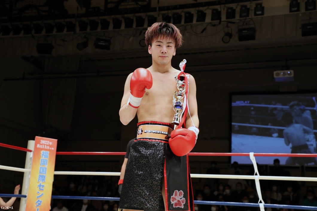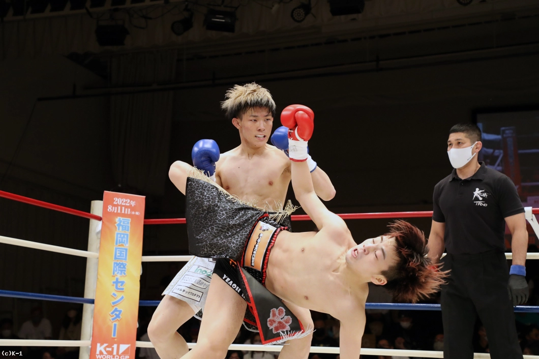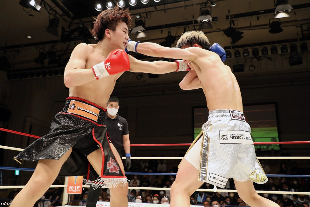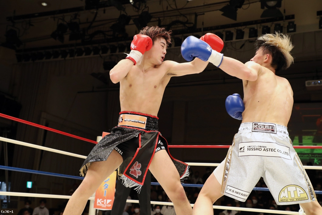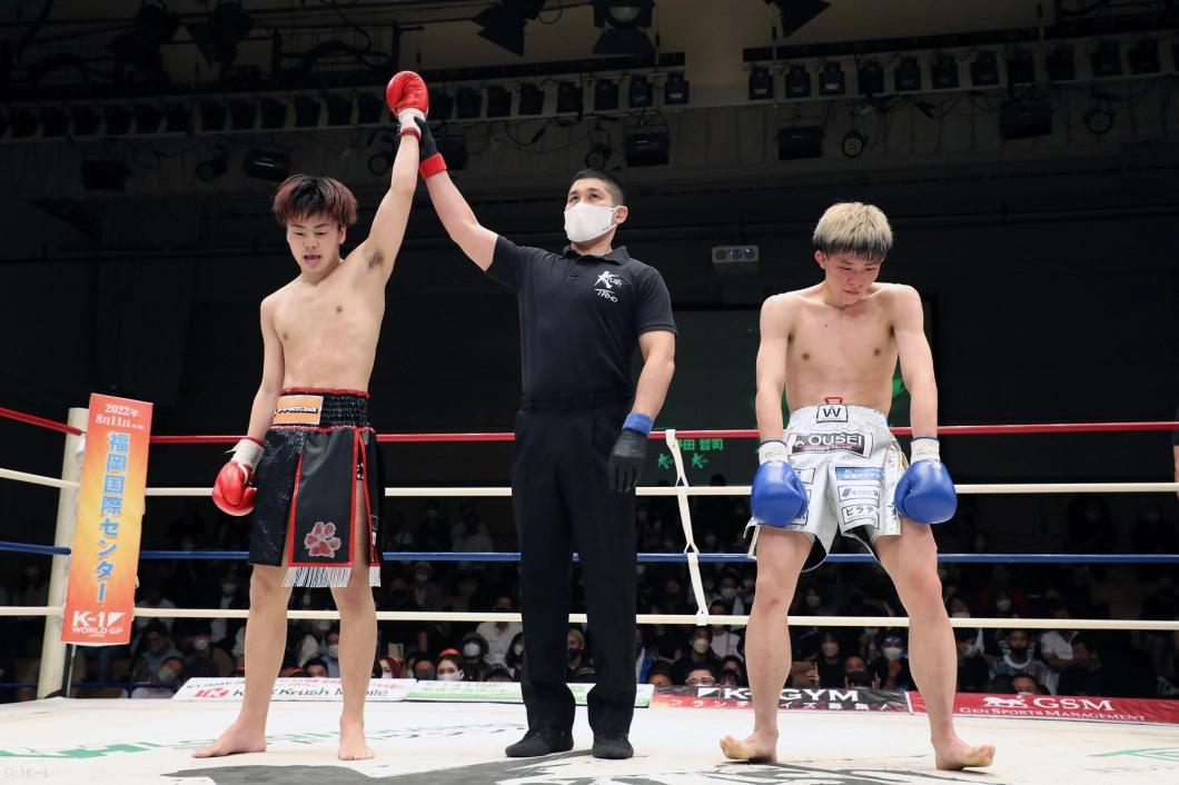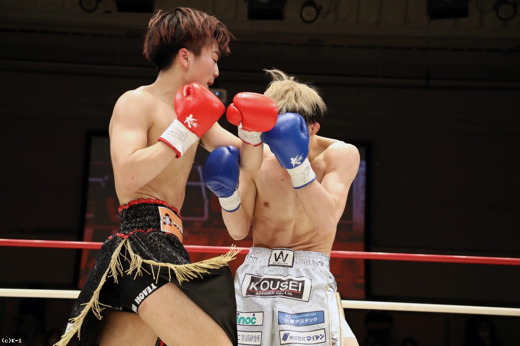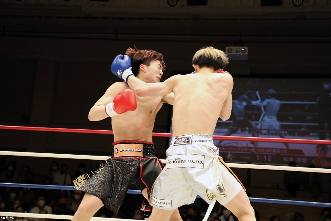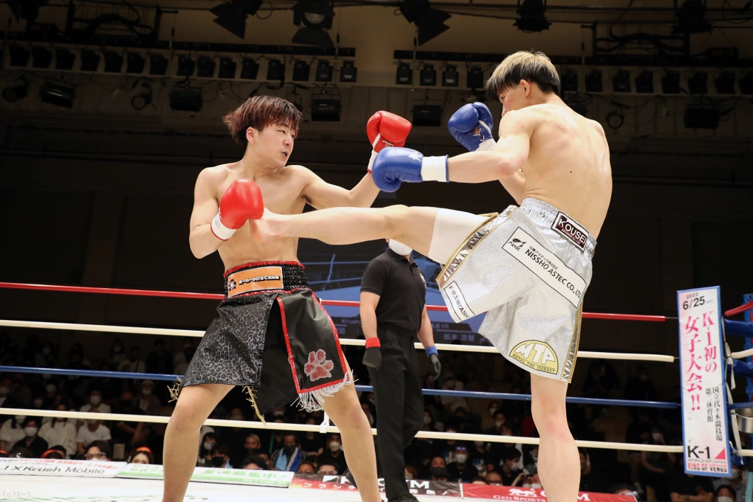 延長R、両者気持ちを出して打ち合いを展開。内側へ見舞う松本の足払いに野田が一瞬バランスを崩す。しかし野田は右ストレートをヒット。松本は距離を作って蹴りで反撃する。野田は左フックの上下打ちからハイキック、松本はヒザとパンチで両者印象を作りに行く。判定は10-9(松本)、10-9(野田)、10-9(野田)の2-1で野田。大接戦を制した。