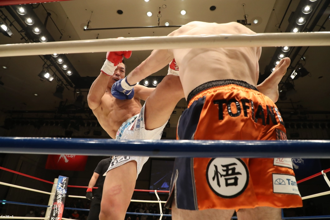 トファネリは再度の後ろ回し蹴りを繰り出し、ハイキックでも鈴木を攻める。さらにフグトルネード(下段後ろ回し蹴り)も鈴木に決める。