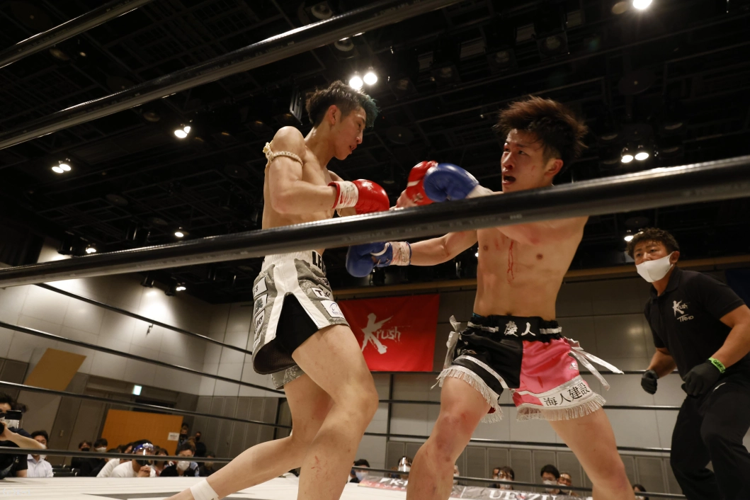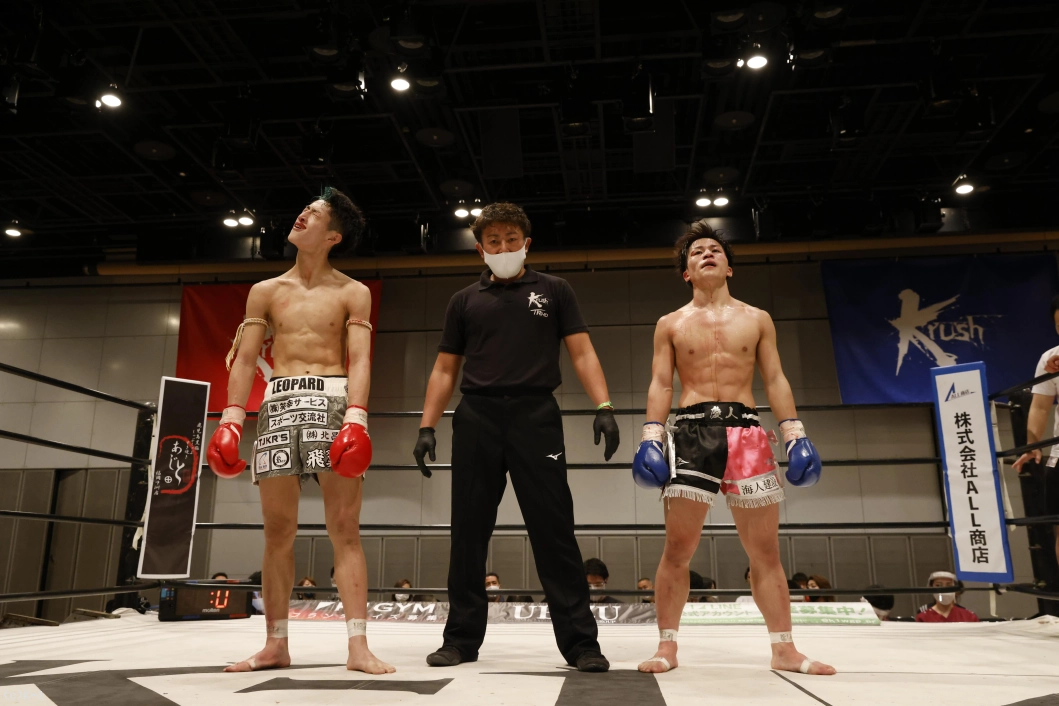 3R、距離を取って右ストレートを打つ山脇。しかし石郷が左フックを強振。これを当てて一気に前に出る。下がる山脇に対して、石郷は左フックとローキックを連打。山脇も右ストレートを返すが、石郷が勢いよく攻め込む。ここで試合終了となり、判定はジャッジ1名が山脇にポイントをつけたものの、残り2名はドロー。フライ級の一戦は引き分けとなった。