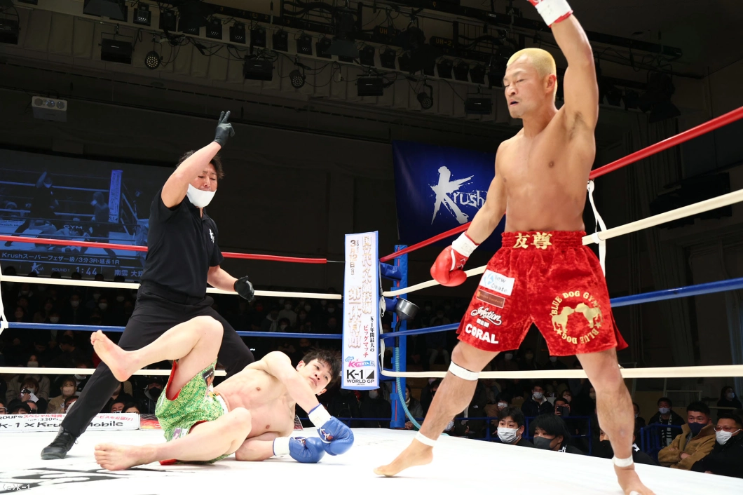 さらに向かった南雲だが、友尊は左右のフックで立て続けにとらえ、3度目のダウンを与えてKOした。