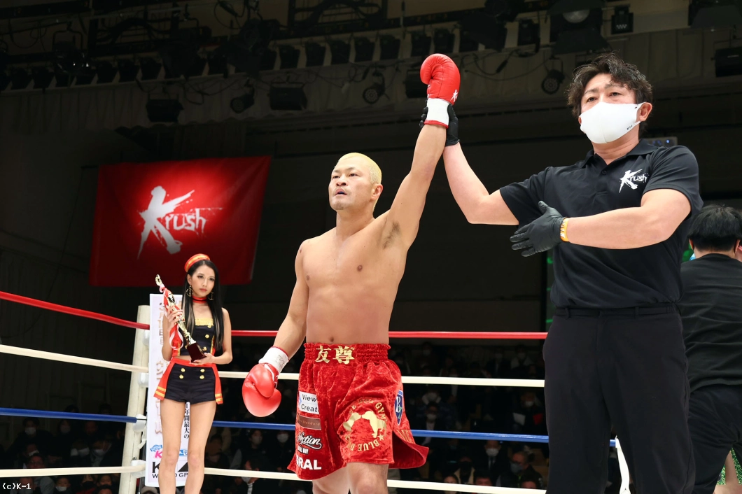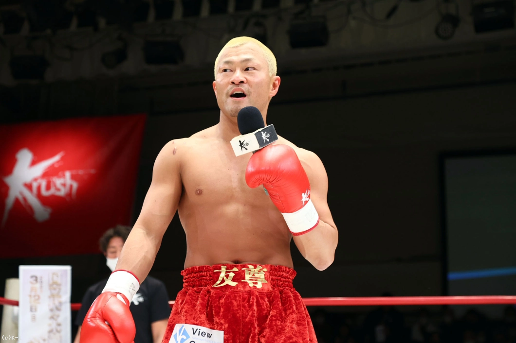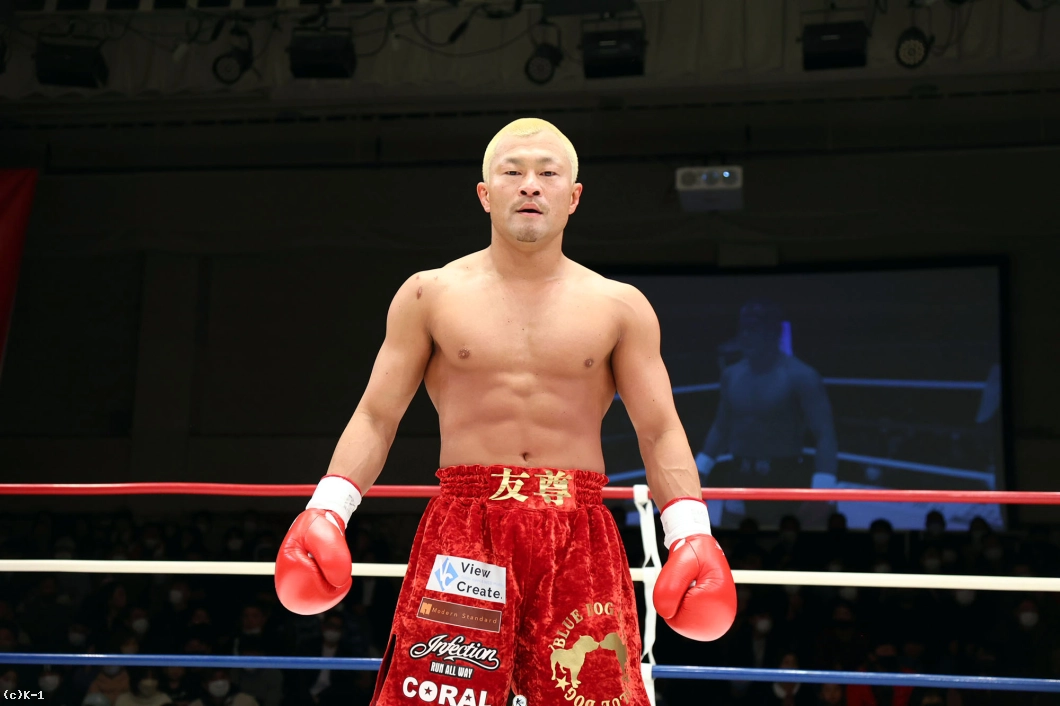 「みなさん、こんにちは友尊です。明けましておめでとうございます! 2023年一発目、第一試合に組んでくれて中村プロデューサーありがとうございます。これがK-1です。これがKrush。これが俺です。今年は必ずチャンピオンになります。見ててください。ありがとうございました」