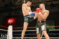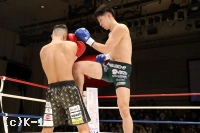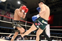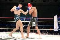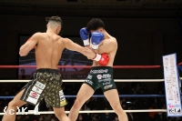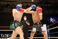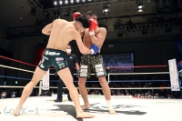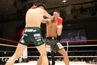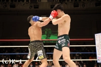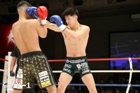 1R、サウスポーの両者はどちらも右ジャブで様子を見合う。三日月蹴り、カーフ、飛びヒザと有効な攻撃を探っているかの稲垣。東本は左ストレートを当てるが、稲垣はそこで持ち崩さず、東本がボディ打ちに来たところへ右フックを当ててダウンを奪う。