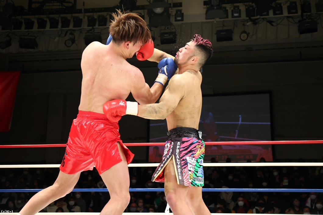 3R、中平はガードでANIMALのパンチを防いでローとカーフキック。しかしANIMALは足にダメージを見せない。中平が後ろ回し蹴りを見せればANIMALはバックブロー。ANIMALは攻勢を変えず、飛びヒザからのパンチ連打、パンチからのヒザと繰り出し終了のゴングを聞く。