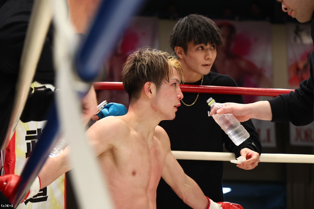 再開すると両者打ち合いに。森坂はミドル、ジャブ、バックブローと攻撃が一辺倒にならない。対して玖村はパンチ中心の攻め。森坂がボディ→顔と左フックを連係してヒット。