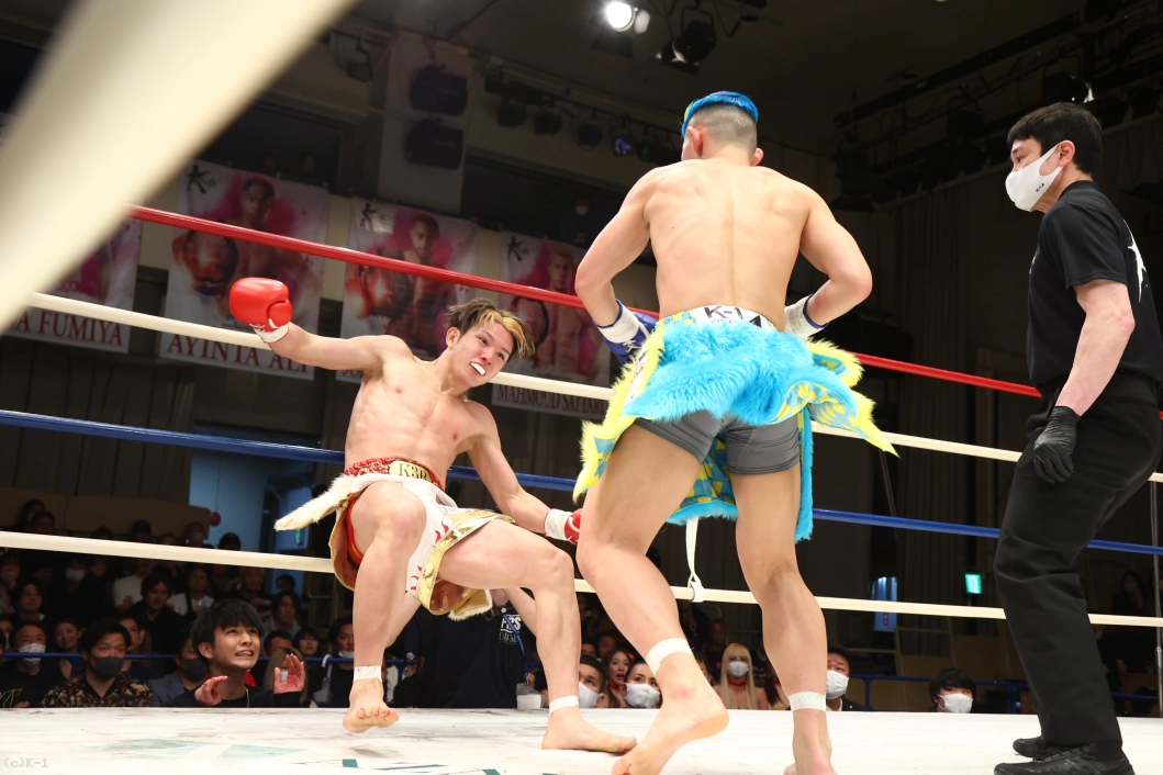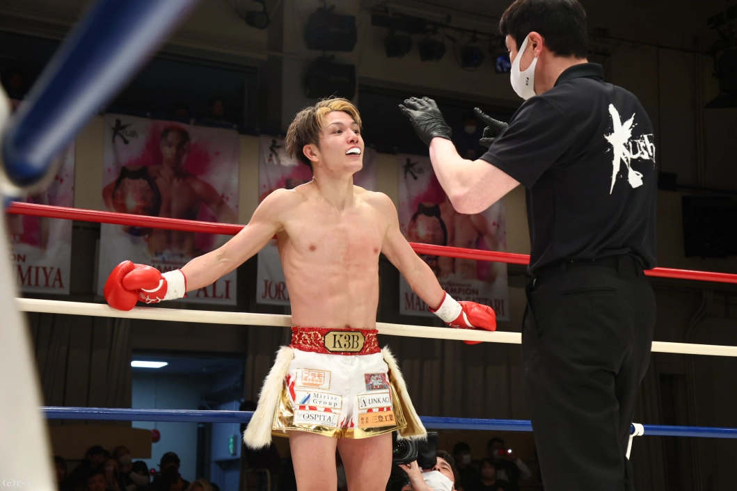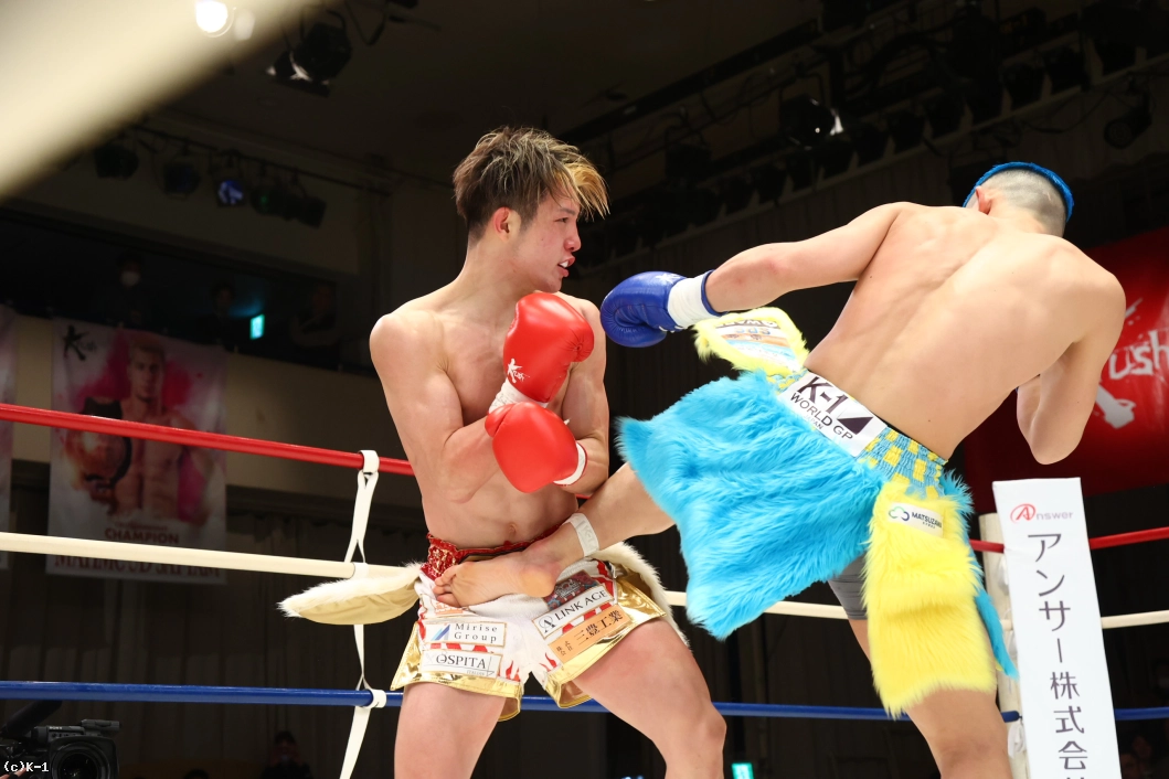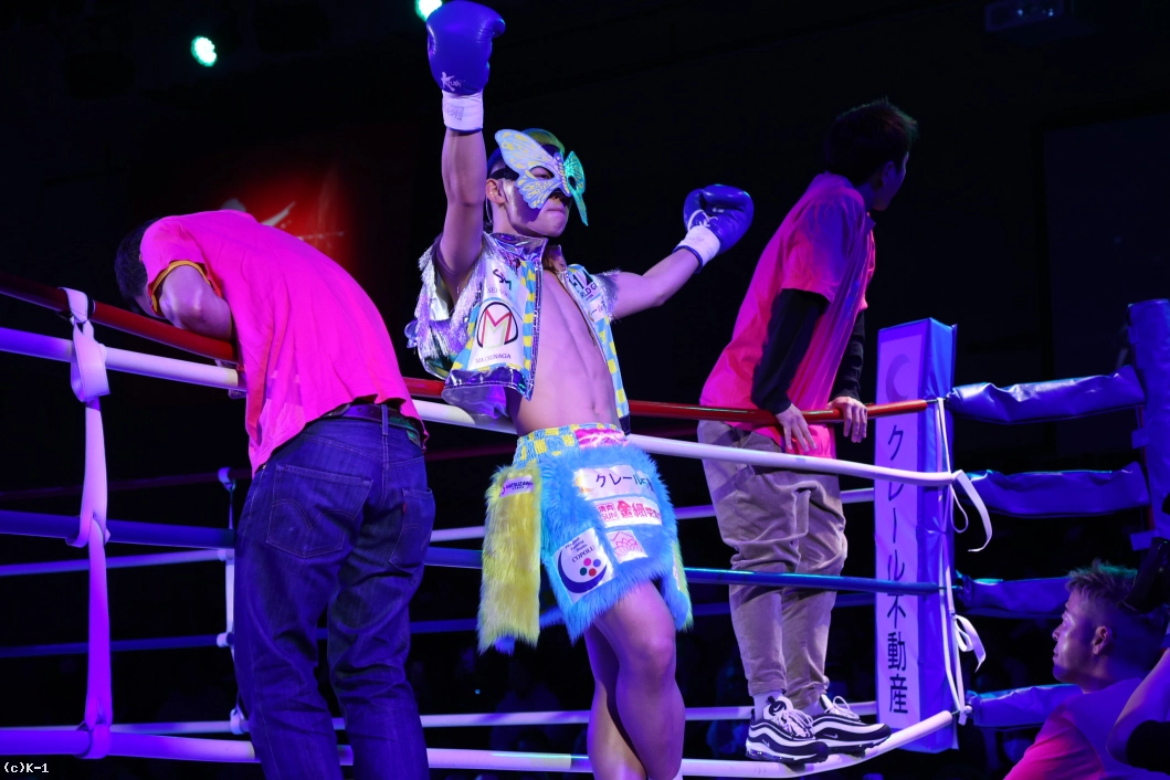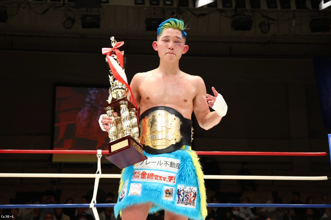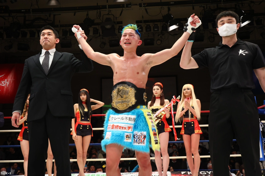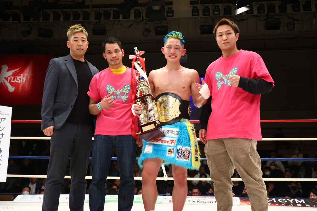 「みなさん、今日は本当に応援ありがとうございました。ずっとこの2年間、ベルトを目指して追ってきて、みなさん応援してくれて、ずっと親の反対から格闘技始まって、好き勝手にやって高校生でプロになって、8年間ずっと応援してくれていて、リングの上で写真が撮りたいです。両親がVIP席に座って見に来てくれてます。ここで写真を撮らせてください。あとで撮ります(苦笑)。これ(王座を)獲れなかったら終わりにしようと思っていたので、突っ走って防衛して、K-1のベルトも巻きますのでよろしくお願いします」