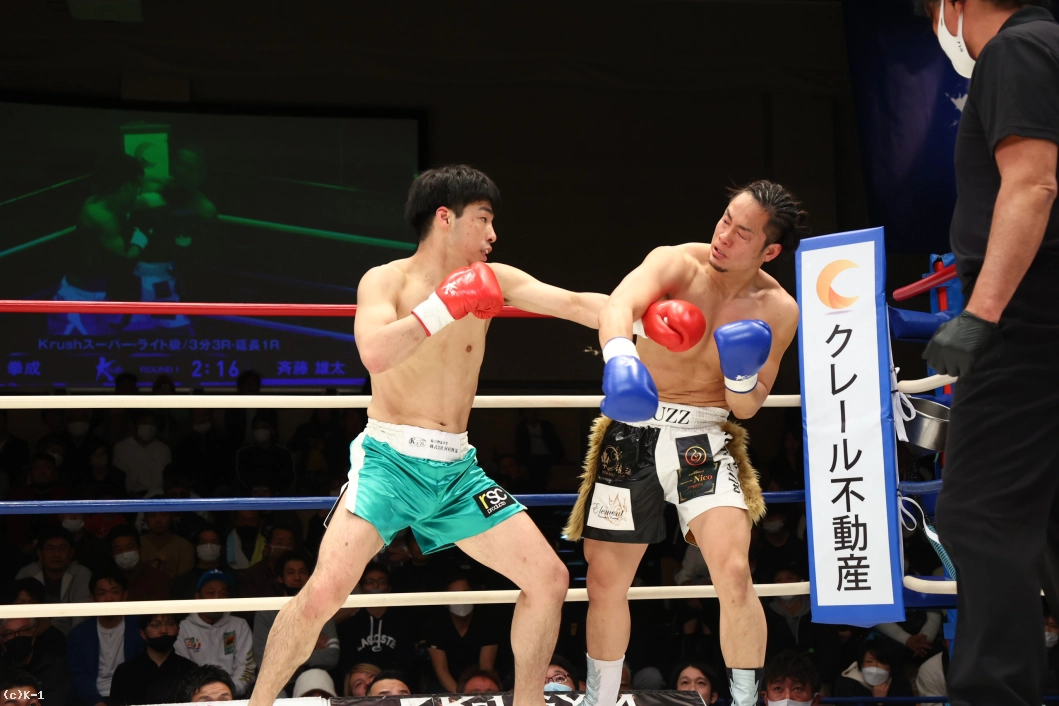立ち上がった斉藤は反撃に出て右アッパーを振るうが、近藤はこれに右ストレートを合わせ初回KOで勝利した。