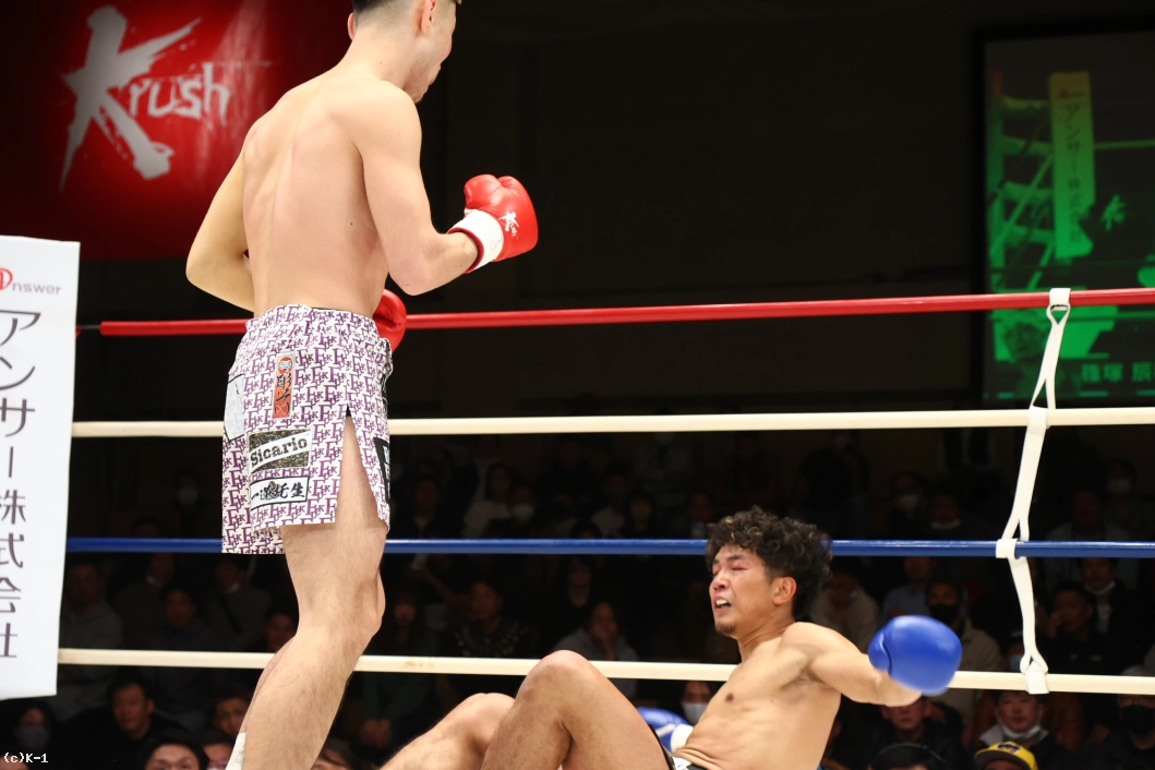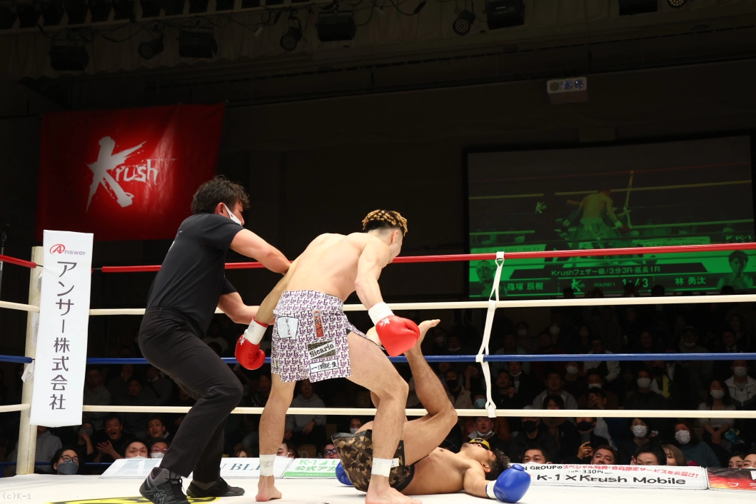 ダメージの感じられる林に篠塚は続いて左フックで2度目のダウンを奪う。林が立つと篠塚はさらに向かい、右ショートフックを打ち込みKOした。
