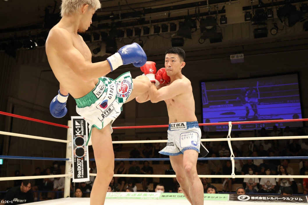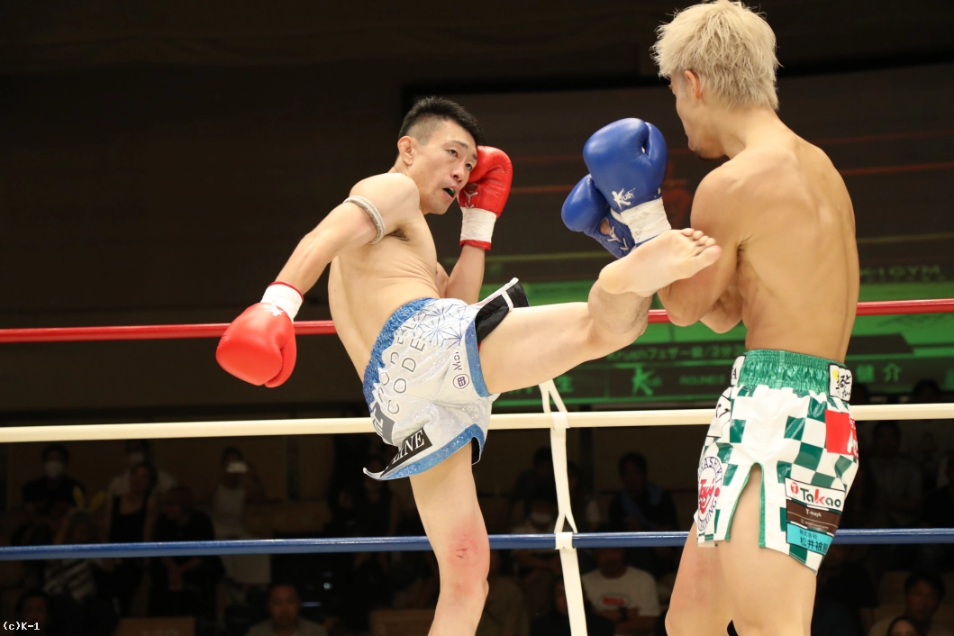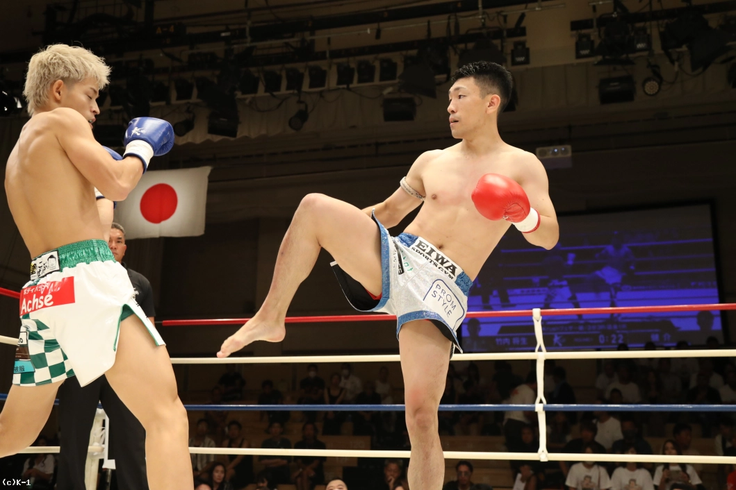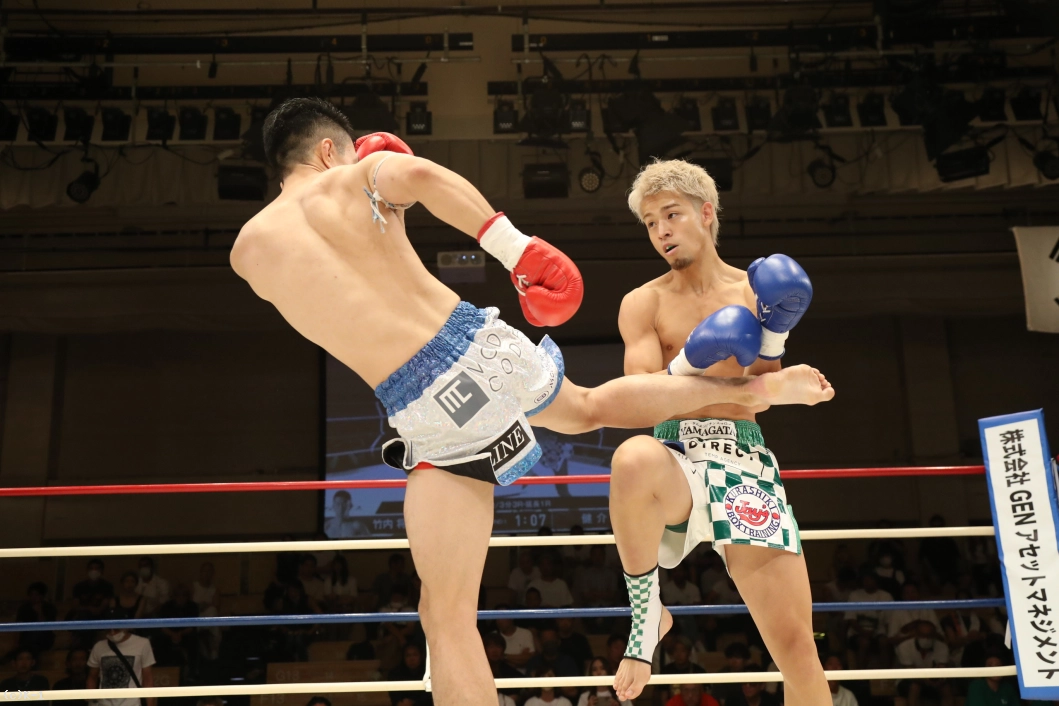 1R、サウスポーの健介が右前蹴り、左ストレートでプレッシャーをかける。竹内は健介の入り際にカウンターを合わせ、飛び込む健介に右フックをヒットさせる。先に手を出す健介に竹内がカウンターを合わせ、離れ際に右ミドルで押し返す展開が続く。