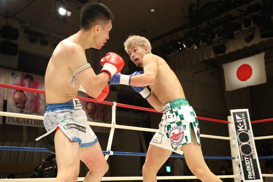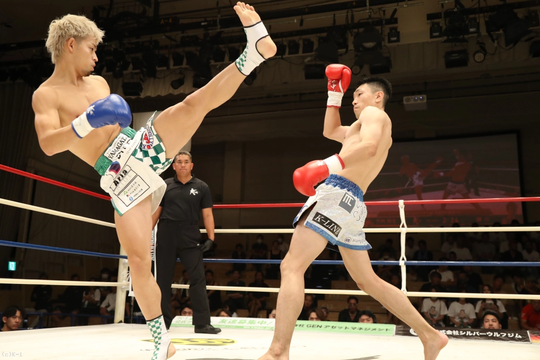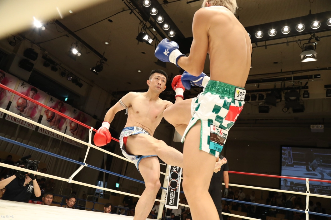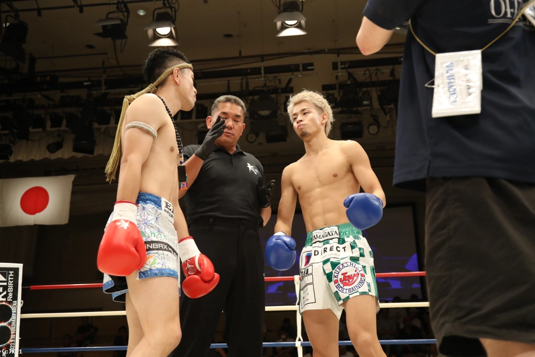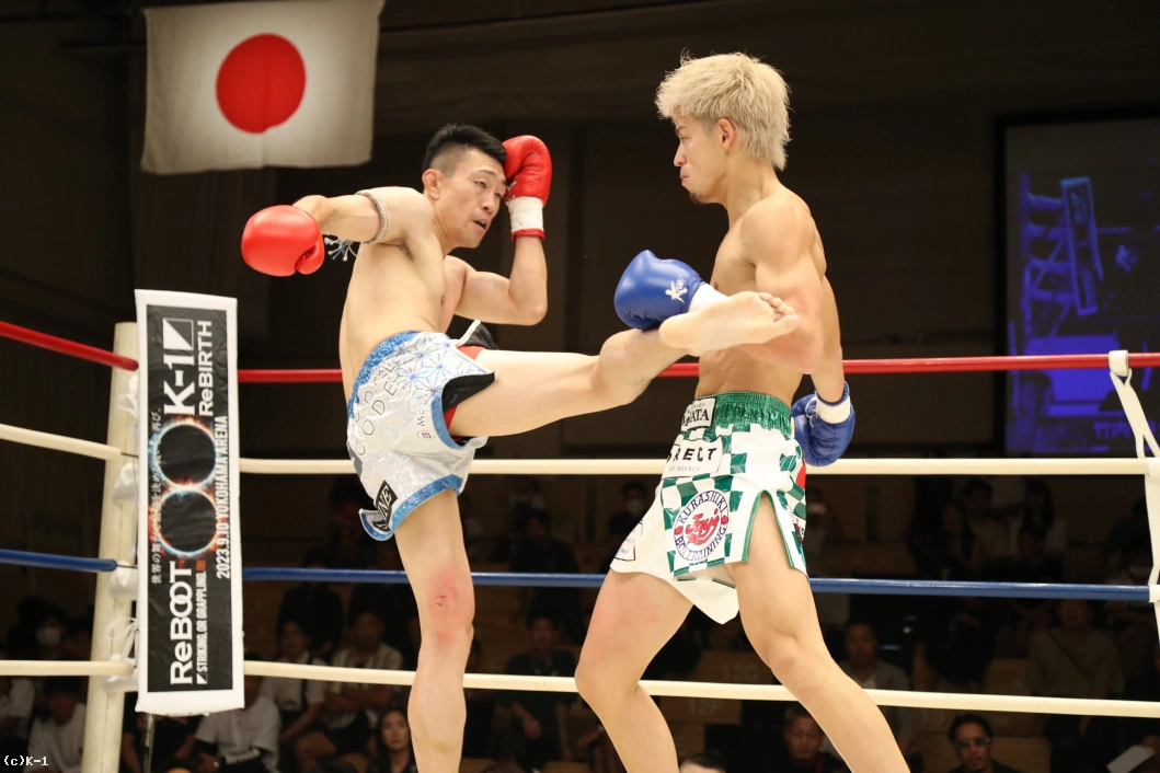 1R、サウスポーの健介が右前蹴り、左ストレートでプレッシャーをかける。竹内は健介の入り際にカウンターを合わせ、飛び込む健介に右フックをヒットさせる。先に手を出す健介に竹内がカウンターを合わせ、離れ際に右ミドルで押し返す展開が続く。