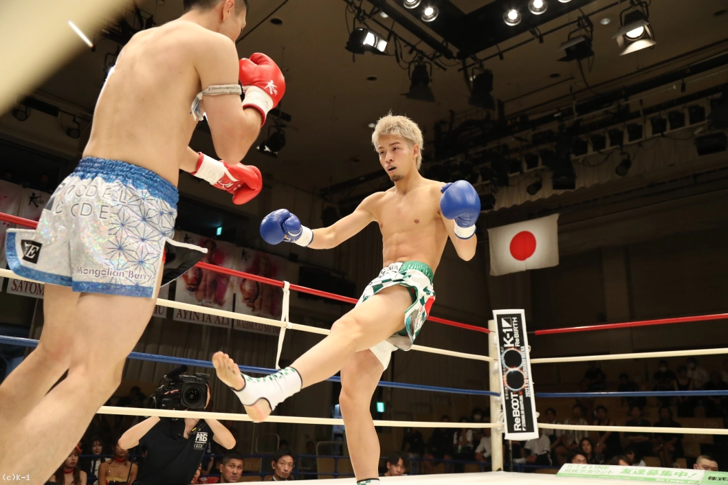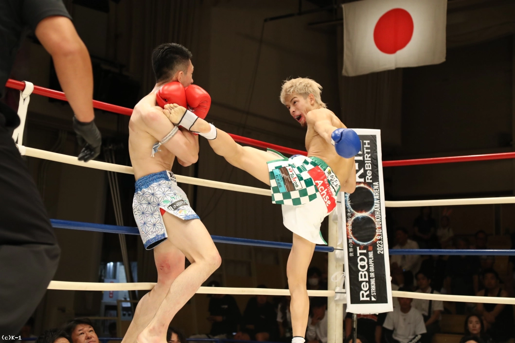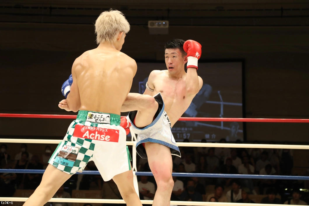 2R、竹内がローブローで注意1を受ける。健介が左の蹴りを上下に散らし、遠い距離から左ストレート。竹内は距離を取りながら右ミドルを強打する。ロープを背負った竹内が左フックを振ると、受けた健介が転倒するがノーダウン。リング中央で両者パンチを交換すると、健介が左右フックをヒットさせ竹内の動きが止まる。