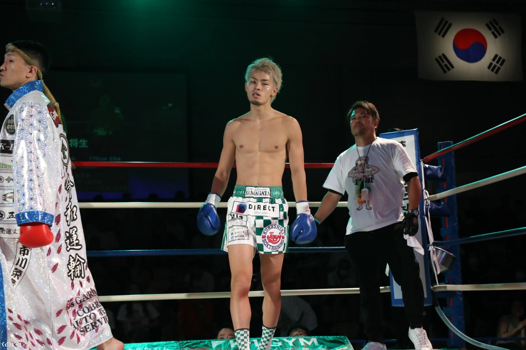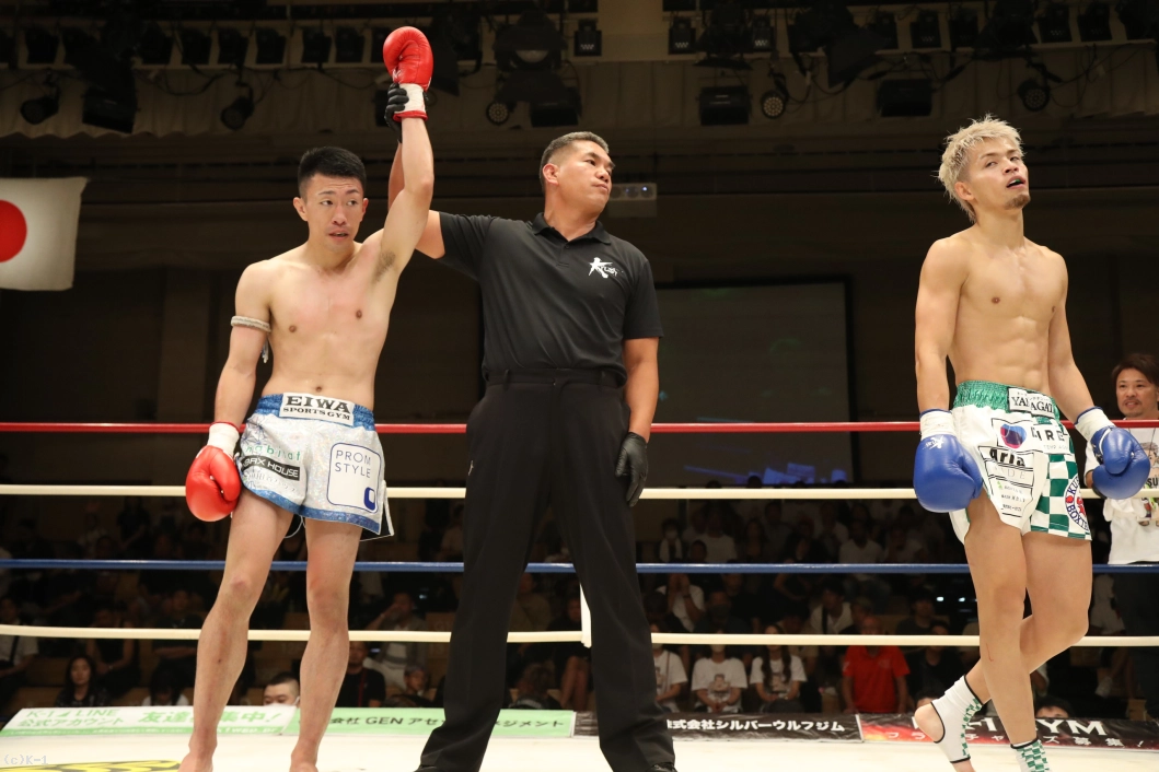 3R、開始直後に2Rのインスタントリプレイにより、健介のノーダウンがダウンと判断される。健介が逆転を狙い前に出るが、竹内は距離を保つ。健介はノーモーションの左ストレートを浅くヒットさせるが、竹内は追撃を許さず。健介が距離を詰めるとヒザを突き上げ、ヒット数を稼ぎながら試合終了のゴングを迎えた。判定は竹内が2Rのダウンのポイントを守り切り勝利。竹内がベテランの技で健介の勢いをシャットアウトした。
