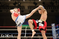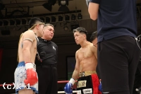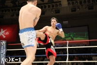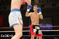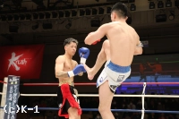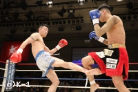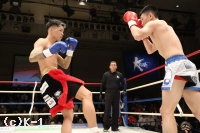 1R、両者、様子見の距離から竹内が右のミドルキック。さらに1発、2発と炸裂させていく。これに対してガードをする佑典だが、飛び込むようにパンチ。ここはクリンチだ。佑典はかけ蹴りのようなキックを繰り出すが、竹内もハイキック。ならばと佑典は右のスーパーマンパンチを繰り出す。それに対して、竹内も得意のキックで応戦して譲らない。