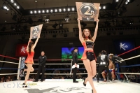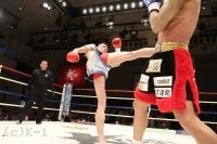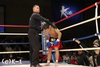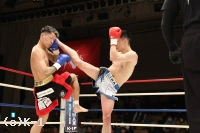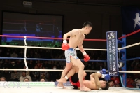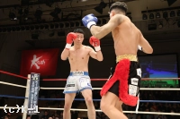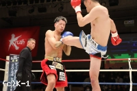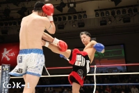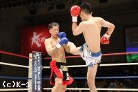 2R、開始早々ミドルキック、ハイキックを連続で繰り出す竹内。佑典にプレッシャーをかける。さらに右のミドルキック、左のローキックを繰り出す竹内。佑典もローキックで応戦するが、竹内は右のハイキックだ。竹内のキック攻撃になかなか手が出ない佑典だったが、強引に前に出てパンチを繰り出す。しかし、竹内もヒットさせない。逆に竹内は右のミドルキックからロープに押し込んだところに飛び込むような右のヒザ蹴りだ。