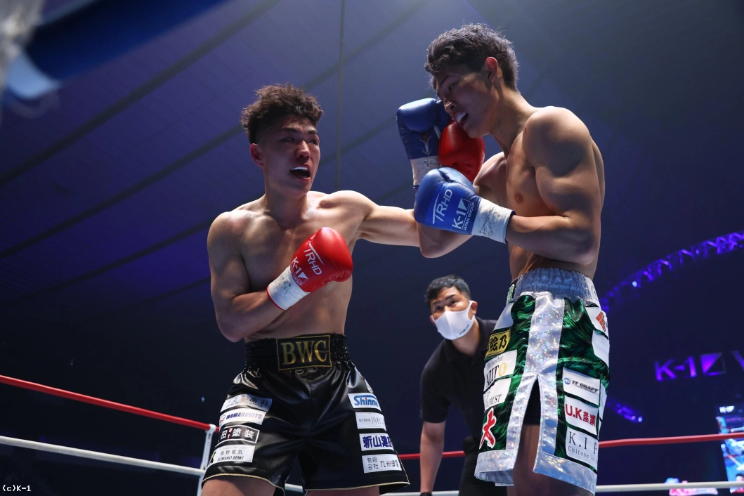 2Rも上野はリーチを活かして距離を保ち、ジャブと前蹴りを飛ばす。竜義も右ストレートをヒット。さらに左フックを当てるが、上野は右ストレート・左フックとパンチを回転させ反撃。上野はボディへのヒザ、三日月蹴りを打ち込んで効かせるが、竜義は間合いを詰めボディフック、左フックと打ち返す。ラウンド終盤はローの上野に左フックの竜義と打ち合いになる。