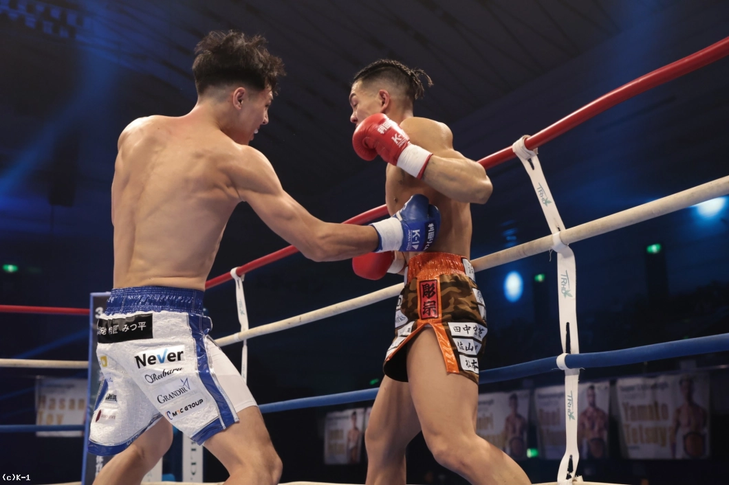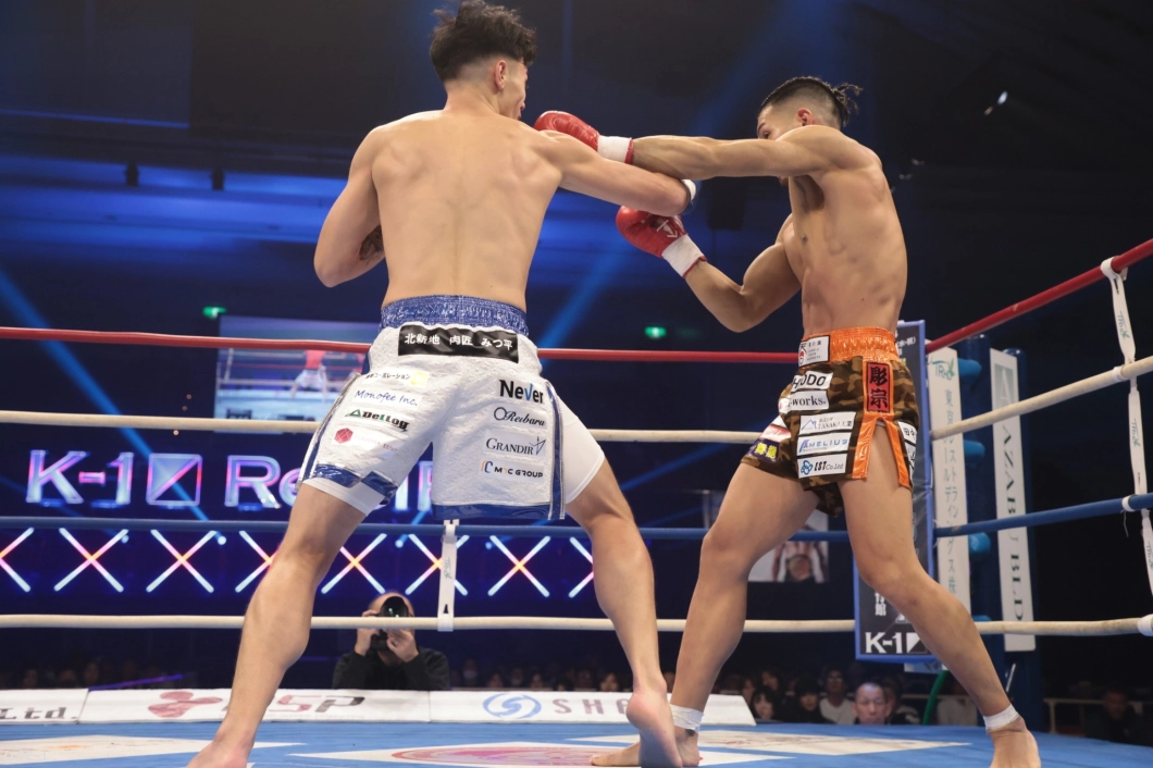 1R、互いにサウスポー構え。海斗はローキック。宇佐美も左ローキック、右のパンチ、さらに右ハイキックを飛ばす。海斗はパンチ連打。そこに宇佐美は右ストレートをヒット。