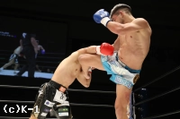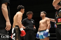 3R、大岩が前進し、頭を付けながら左右フック。アギーレのパンチに右カーフをあわせる。アギーレは至近距離でアッパー、ローを左右で繰り出すコンビネーション。離れれば飛びヒザ蹴りで大岩を押し返す。大岩も左右フックに右カーフを織り交ぜ、攻撃を上下に散らす。最後は攻撃を出しながらもみ合うままゴングを向かえた。判定は1者がアギーレを支持するが、2者がドローを付け延長戦へ。