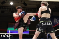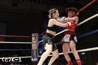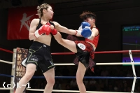1R、体格に勝る坂上がジワリとプレッシャーをかける。小さく左右に回るサウスポーの世愛へ鋭いワンツー。世愛は右ジャブ、前蹴りでけん制するが、坂上のプレッシャーに踏み込めない。終盤には距離を詰めた坂上の右ストレートがヒット。