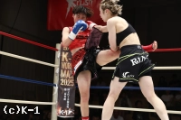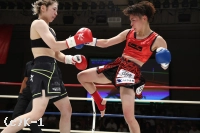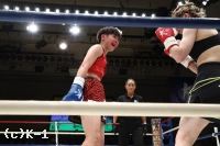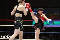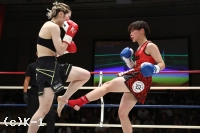 2R、世愛の左前蹴りに坂上がカウンターの右ストレート。坂上はさらに圧力を強め、ロープ際で左右フックのラッシュを見せる。世愛はワンツーを伸ばし、左右に回りながらヒットアンドアウェイ。坂上の打ち終わりに右インローを合わせていく。