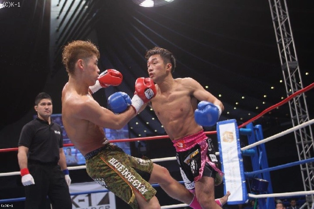 1R、神戸がじりじりとプレッシャーをかけてジャブと右ロー、ミドルを蹴る。勇磨は前に出てくる神戸にヒザ蹴りと右ローを返す。終盤、神戸が右ストレートから前に出た。